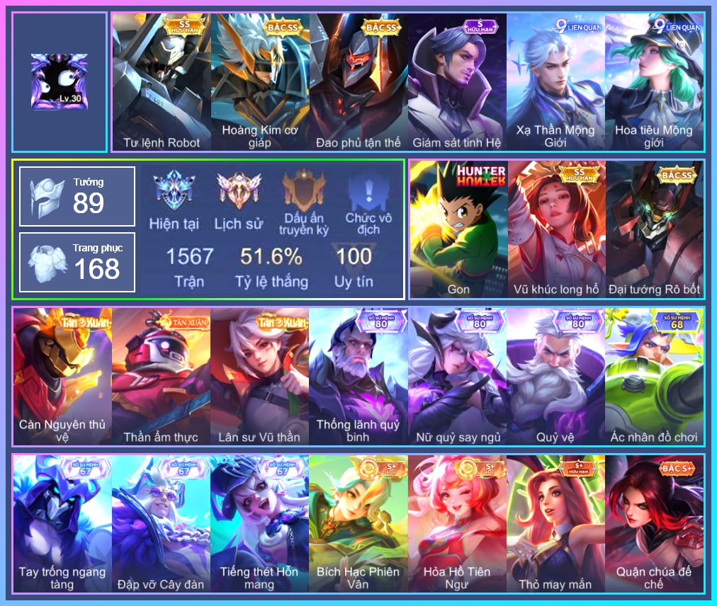 Valhein Hoàng tử Quạ, Valhein Số 7 Thần Sầu, Valhein S-Quang Vinh, Triệu Vân Quý Công Tử, Tulen Phù Thủy Kiến Tạo, Tulen Đông êm đềm, Tulen Dạ hội, Grakk Thuyền Trưởng Râu Đỏ, Grakk Thần ẩm thực, Butterfly Thánh nữ khởi nguyên, Maloch Samurai Tử Sĩ, Maloch Ác nhân vô tuyến, Maloch Đại ca Mukbang, Wisp Ếch nhồi bông, Krixi Công chúa Bướm, Annette Nữ quản ga, Annette Xứ sở thần tiên, Preyta Không Tặc, Gildur Đại gia học viện, Ata Quang vinh, Arduin, Amily Đặc cảnh NYPD, Amily Hội ám hoàng, Yorn Lục nguyệt cung, TelAnnas Cảnh Vệ Rừng, TelAnnas Chung Tình Tiễn, Telannas Dạ hội, TelAnnas Quang Vinh, Natalya Thần Phú Quý, Violet Huy Chương Vàng, Điêu Thuyền Mèo công nghệ, Zephys Đầu bếp Sashimi, Veera Goá Phụ, Veera Bách hoa tiên nữ, Richter Quang vinh 2.0, Thorne Cận vệ hoàng gia, Volkath Tư lệnh viễn chinh, Aya Điệp viên ký ức, Max Thần đồng sinh hóa, Bright Soái ca thánh điện, Bright Kỳ Lân Soái, Ignis Bắc băng vương, Veres Đạo tặc, Veres Chị đại học đường, Nakroth Quân đoàn địa ngục, Aoi Sát Thủ Đô Thị, Dextra Lữ khách cao nguyên, Raz Chiến thần Muay Thái, Raz Siêu việt, Yue Tiểu công Chúa, Ngộ Không Siêu việt, Thane Mật vụ, Arthur Siêu sao Cricket, Sinestrea Đại tiểu thư 2, Aleister Xứ sở thần tiên, Quillen Trưởng ngoại khoa, Paine khúc nhạc tử vong, Zill Thần mộng mị, Ormarr Giáo Viên Thể Hình, Zuka Rapper Big Panda, Airi Mỵ Hồ, Slimz Thỏ Thợ Mỏ, Slimz Thỏ nhồi bông, Slimz Sứ giả Thiên giới, Slimz Siêu Cấp Tối Thượng, Murad S-Quang Vinh, Liliana thần tượng âm nhạc, Fennik Nhà thám hiểm, Fennik Đội đặc nhiệm, Enzo Thần thoại Hy Lạp, Azzenka Quang Vinh 2.0, Roxie Hỏa thuật sư, Sephera Phi vụ thế kỷ, Capheny S-Quang Vinh, -Zip Gà siêu quậy2, Keera Y tá lạ, Darcy Nam tước