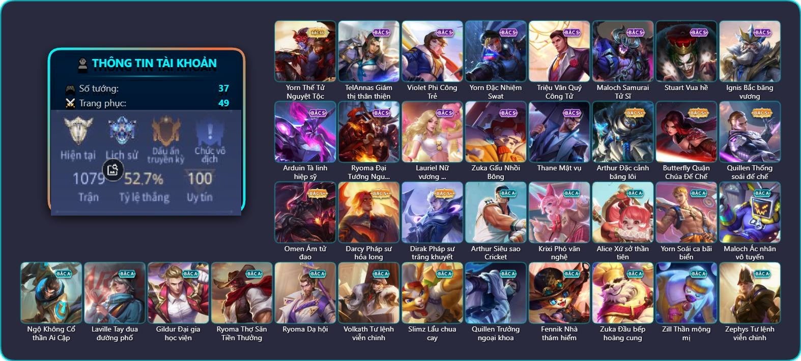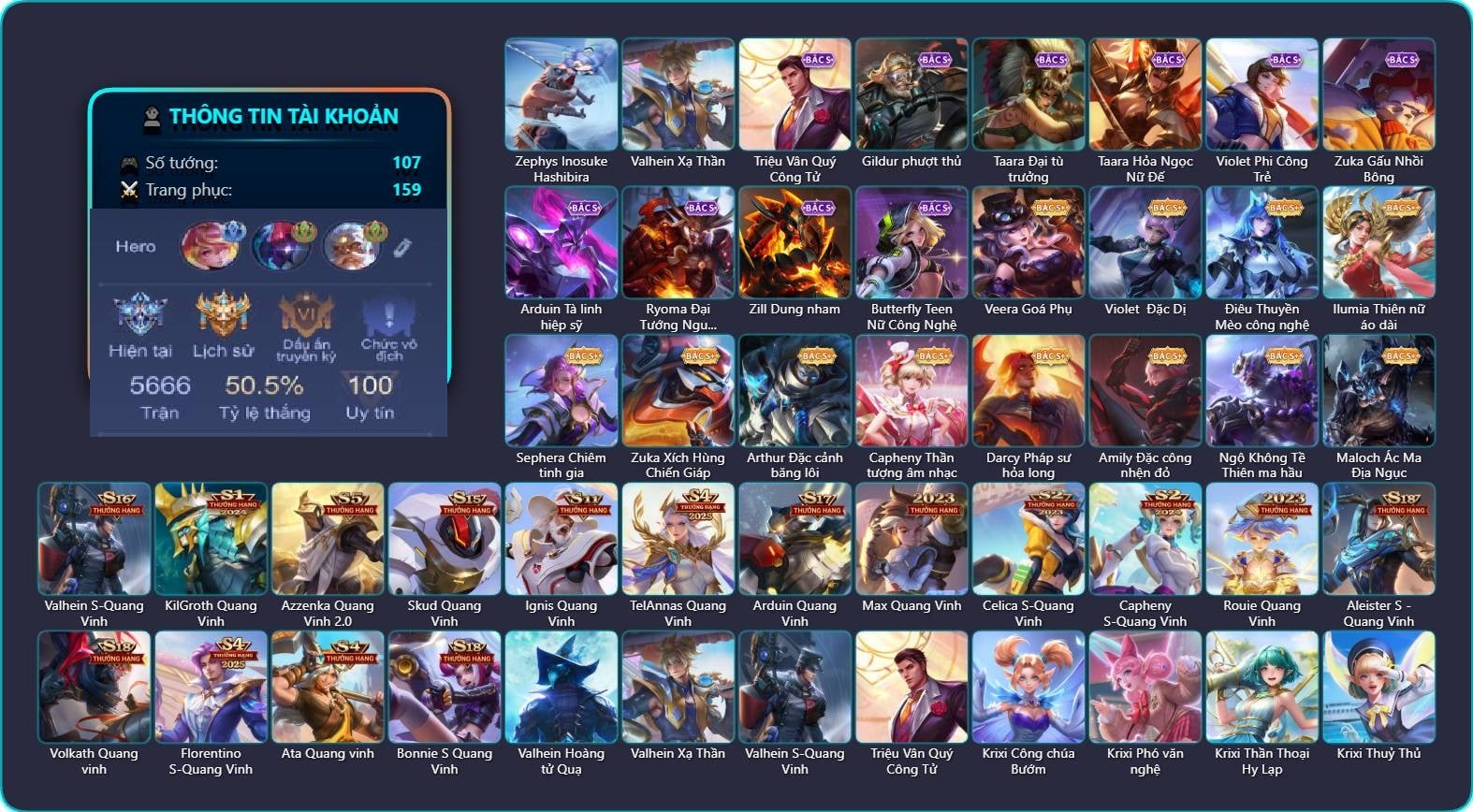 Valhein Hoàng tử Quạ, Valhein Xạ Thần, Valhein S-Quang Vinh, Triệu Vân Quý Công Tử, Triệu Vân Thần Tài, Krixi Công chúa Bướm, Krixi Cô Tiên Thỏ, Celica S-Quang Vinh, Elandorr Phi vụ thế kỷ, Murad Thợ Săn Tiền Thưởng, Murad S-Quang Vinh, Qi Thiếu nữ mùa xuân, Qi Blogger Ẩm thực, Hayate Bạch lang, Toro Bạch mao Ngưu, Gildur phượt thủ, Gildur Đại võ sư, Gildur Thuyền trưởng râu bạc, Enzo Phẩm chất quý tộc, The Flash Tia chớp tương lai, Preyta Không Tặc, Preyta Phi cơ F1, Kahlii Siêu đầu bếp, Mganga Hề cung đình, Errol Vượt ngục, Errol Diệt nguyệt tiên phong, Richter Dạ hội, Richter Quang vinh 2.0, Capheny S-Quang Vinh, Veres Chị đại học đường, Florentino Vũ kiếm sư, Florentino Kiếm sĩ Olympic, Florentino Thần thoại Hy Lạp, Violet Phi Công Trẻ, Violet Huy Chương Vàng, Azzenka Quang Vinh 2.0, Arduin, Arduin Quang Vinh 1, Zill Dung nham, Zill Thần mộng mị, Dirak Quý tộc, Dirak Ông bầu Showbiz, Max Quang Vinh, Kriknak Bọ Cánh Bạc, Slimz Sứ giả Thiên giới, Ryoma Đại Tướng Nguyệt Tộc, Ryoma Dạ hội, Arthur Hoàng kim cốt, Alice Dạ hội, Nakroth Lôi Quang Sứ, Nakroth Producer Tia chớp, Nakroth Siêu Việt 1, Omega Hộ vệ ba bích, Điêu Thuyền Nữ Vương Anh Đào, Điêu Thuyền Nữ y tá, Teemee Tay đua siêu tốc, Rouie Quang Vinh, Marja Linh Xà Tư Tế, Kaine Người dơi, Paine khúc nhạc tử vong, Wisp Ếch nhồi bông, TelAnnas Cảnh Vệ Rừng, TelAnnas Quang Vinh, Lindis Thám Tử Tư, Lindis Đồng phục Shihakusho, Natalya Mị muốn đi chơi, Natalya Quý Cô Thủy Tề, Amily Hội ám hoàng, Butterfly Thủy thủ, Butterfly Teen Nữ Công Nghệ, Butterfly Gánh anh đến cùng, Raz Đại tù trưởng, Raz Saitama Cosplay, Ilumia Nữ Chúa Tuyết, Ilumia Diva nổi loạn, Ilumia Ngược dòng thời gian, Cresht Thợ sửa cáp, Sephera Quý tiểu thư, Sephera Phi vụ thế kỷ, Sephera Thủy Liên Hoa, Laville Tay đua đường phố, Laville Tay súng vô địch, Maloch Ác Ma Địa Ngục, Maloch Tiệc hóa trang, Maloch Samurai Tử Sĩ, Maloch Ác nhân vô tuyến, Airi Thích Khách, Airi Cấm Vệ Nguyệt Tộc, Airi Đặc công tử điệp, Airi Lễ hội mùa xuân, Zuka Phát Tài, Zuka Đầu bếp hoàng cung, Zuka Rapper Big Panda, KilGroth Cảnh Vệ Biển, Taara Hỏa Ngọc Nữ Đế, Roxie Lễ hội hoa, Thorne Ước nguyện giáng sinh, Thane Kẻ Hủy Diệt, Tulen Phù Thủy Kiến Tạo, Tulen Dạ hội, Fennik Tay đua F1, Zephys Phi thương, Zephys Tư lệnh viễn chinh, Zephys Inosuke Hashibira, Lauriel Đọa Lạc Thiên Sứ, Lauriel Nữ vương học đường 2, Ata Quang vinh, Ata Mèo đi mưa, Arum Thú Vệ Cổ Mộ, Arum Linh tượng vu nữ, Arum Nữ hoàng gấu xám, Lumburr, Ngộ Không Đạo tặc, Lữ Bố Kỵ Sĩ Âm Phủ, Dextra Quý cô Tuổi Dần, Omen Ám tử đao, Omen Thuyền trưởng hải tặc, Liliana thần tượng âm nhạc, Liliana Thuỷ thủ hồ ly