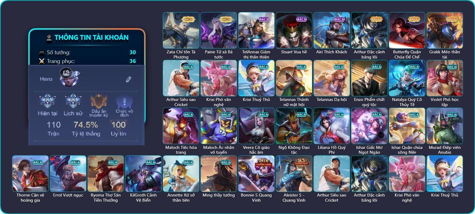 Arthur Hoàng kim cốt, Arthur Siêu sao Cricket, Arthur Đặc cảnh băng lôi, Krixi Cô Tiên Thỏ, Krixi Phó văn nghệ, Krixi Thuỷ Thủ, TelAnnas Giám thị thân thiện, Valhein Hoàng tử Quạ, Butterfly Teen Nữ Công Nghệ, Butterfly Quận Chúa Đế Chế, Triệu Vân Quý Công Tử, Maloch Ác Ma Địa Ngục, Maloch Ác nhân vô tuyến, Veres Đạo tặc, Veres Chị đại học đường, Zephys Tư lệnh viễn chinh, Zephys Đầu bếp Sashimi, Stuart Vua hề, Grakk Thuyền Trưởng Râu Đỏ, Rouie Quang Vinh, Ngộ Không Đạo tặc, Ngộ Không Cổ thần Ai Cập, Mina Tiệc Bánh Kẹo, Mina Đào tạo siêu sao, Ignis Bắc băng vương, Alice The Butterfly Mansion Girl, Yorn Thế Tử Nguyệt Tộc, Yorn Soái ca bãi biển, Sephera Thủy Liên Hoa, Errol Stream đến bao giờ, Zill Diệt nguyệt tử sĩ, Gildur Đại gia học viện, Kahlii Siêu đầu bếp, Kahlii Tử điệp, Hayate Bạch lang, Lauriel Nữ vương học đường 2, Murad Thợ Săn Tiền Thưởng, Murad S-Quang Vinh, Lữ Bố Nam Vương, Fennik Nhà thám hiểm, Liliana Thuỷ thủ hồ ly, Ryoma Dạ hội, Airi Kiemono, Paine khúc nhạc tử vong, Zuka Đầu bếp hoàng cung, Zuka Rapper Big Panda, Bright Kỳ Lân Soái, Ilumia Ngược dòng thời gian, Taara Hỏa Ngọc Nữ Đế, Celica Tâm hồn trà sữa, Keera Nghệ sĩ Graffiti, Richter Quang vinh 2.0, Florentino Hisoka, Elsu Mafia, Azzenka Quang Vinh 2.0, Violet Huy Chương Vàng, Enzo Leo núi, Sinestrea Đại tiểu thư 2