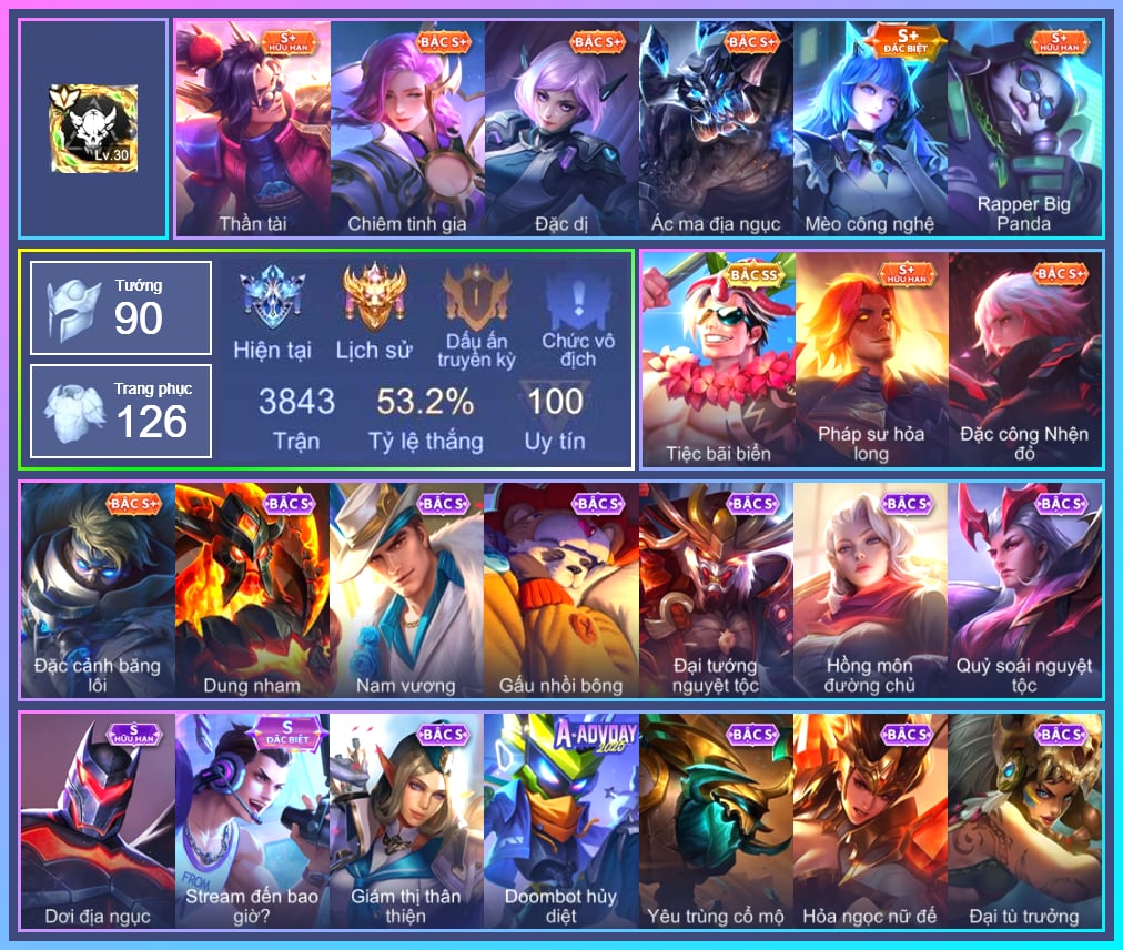 Arthur Hoàng kim cốt, Arthur Siêu sao Cricket, Arthur Đặc cảnh băng lôi, Krixi Xứ Sở Thần Tiên, Krixi Phó văn nghệ, TelAnnas Giám thị thân thiện, TelAnnas Chung Tình Tiễn, Telannas Thánh nữ mật hội, Telannas Dạ hội, Tel Annas Jujutsu Sorcerer, Valhein Hoàng tử Quạ, Valhein Đại Công Tước, Valhein Số 7 Thần Sầu, Valhein S-Quang Vinh, Butterfly Quận Chúa Đế Chế, Butterfly Bình Minh Tận Thế, Violet Phi Công Trẻ, Violet Phó học tập, Violet Đặc Dị, Violet Tay Súng Siêu Phẩm, Violet Huy Chương Vàng, Ngộ Không Đạo tặc, Ngộ Không Siêu việt, Ngộ Không Đặc vụ băng hầu, Ngộ Không Nhóc tỳ bá đạo, Ngộ Không Cổ thần Ai Cập, Natalya Quý Cô Thủy Tề, Triệu Vân Quý Công Tử, Triệu Vân Thần Tài, Maloch Ác Ma Địa Ngục, Maloch Đại ca Mukbang, Stuart Vua hề, Stuart Gã hề, Grakk Thuyền Trưởng Râu Đỏ, Grakk Khô Lâu Đại Tướng, Grakk Màu cờ sắc áo, Grakk Cận vệ Mafia, Grakk Thần ẩm thực, Laville Tay đua đường phố, Alice Bé Gấu Tuyết, Alice Xứ sở thần tiên, Alice The Butterfly Mansion Girl, Toro Trung Phong Cắm, Gildur Đại gia học viện, Omen Sĩ Quan Viễn Chinh, Omen Ám tử đao, Zuka Gấu Nhồi Bông, Zuka Đầu bếp hoàng cung, Zuka Rapper Big Panda, Kriknak Bọ Cánh Bạc, Zephys Phi thương, Ilumia Nữ Chúa Tuyết, Rouie Quang Vinh, Yorn Đặc Nhiệm Swat, Yorn Soái ca bãi biển, Kahlii Tử điệp, Mganga Doombot Hủy Diệt, Enzo Thần thoại Hy Lạp, Enzo Leo núi, Amily Nữ đội trưởng, Amily Thám tử trung học, Azzenka Quang Vinh 2.0, Aleister Xứ sở thần tiên, Capheny Hầu gái, Capheny S-Quang Vinh, Ignis Hỏa Thuật Sư, Yena Nữ hoàng thể thao, Yena Nữ cướp biển, Florentino Vũ kiếm sư, Florentino Giám sát tinh hệ, Florentino Kiếm sĩ Olympic, Florentino Thần thoại Hy Lạp, Tachi Đao khách vô tình, Thane Kẻ Hủy Diệt, Thane Mật vụ, Elsu Cảnh vệ thảo nguyên, Elsu Mafia, Xeniel Thiên Sứ Hủy Diệt, Xeniel Kim sí điểu, Xeniel Shipper bánh mỳ, Zip Gà siêu quậy, Zip Tiểu đệ hổ báo, Zip Ông trùm giáng sinh, Murad Thợ Săn Tiền Thưởng, Murad M-TP Thần Tượng Học Đường, Murad Đồ thần đao, Murad S-Quang Vinh, Veres Đạo tặc, Veres Chị đại học đường, Slimz Thỏ Thợ Mỏ, Slimz Sứ giả Thiên giới, Slimz Siêu Cấp Tối Thượng, Fennik Nhà thám hiểm, Fennik Đội đặc nhiệm, Fennik Tiệc Bánh Kẹo, Baldum chú thợ ống nước, Raz Đại tù trưởng, Elandorr Soái tặc, Elandorr Phi vụ thế kỷ, Astrid Bạch Kiếm Tiểu Thư, Zata Tư lệnh viễn chinh, Nakroth BBoy công nghệ, Ybneth Hạt trưởng kiểm lâm, Ybneth Động cơ vĩnh cửu, Ybneth Candy Bear, Sephera Thủy Liên Hoa, Errol Vượt ngục, Errol Stream đến bao giờ, Errol Sát thủ Mafia, Ata Mèo đi mưa, Zill Lốc Địa Ngục, Dirak Đường chủ yêu giới, Hayate Bạch ảnh, Hayate Bạch lang, Lauriel Nữ vương học đường 2, Airi Kiemono, Airi Đặc công tử điệp, Celica Nữ cao bồi, Celica S-Quang Vinh, Celica Tâm hồn trà sữa, Aoi Sát Thủ Đô Thị, Aoi Tiểu thư Mafia, Lindis Thám Tử Tư, Moren Anh thợ điện, Kaine Thợ Săn Chính Nghĩa, Rourke Cuồng tặc, Taara Hỏa Ngọc Nữ Đế, Richter Quang vinh 2.0, Bright Soái ca thánh điện, Bright Kỳ Lân Soái, Lumburr, Điêu Thuyền Nữ Vương Anh Đào, Điêu Thuyền Nữ y tá, Jinna Hỏa nhãn ma vương, Lorion Chiến giáp hắc ám, Keera Học viên Carano, Keera Hồ điệp, Qi Tiểu long, Qi Đặc vụ cáo tuyết, Roxie Hỏa thuật sư, Quillen Đặc công mãng xà, Sinestrea Lữ khách sa mạc, Thorne Cận vệ hoàng gia, Ryoma Dạ hội, Max Găng Tay Vàng, Max Tiểu King Kong, Dextra Lữ khách cao nguyên, Arduin, Liliana Thuỷ thủ hồ ly, Annette Xứ sở thần tiên, KilGroth Cảnh Vệ Biển, Bonnie S Quang Vinh, Marja Linh Xà Tư Tế