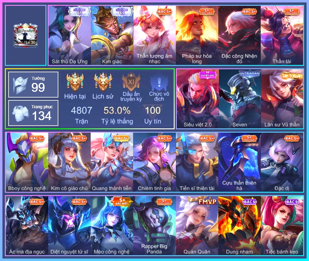 Valhein Hoàng tử Quạ, Valhein S-Quang Vinh, Triệu Vân Quý Công Tử, Triệu Vân Thần Tài, Krixi Phó văn nghệ, Krixi Thuỷ Thủ, Mina Tiểu thư đoạt hồn, Mina Chị đại lắm chiêu, Mina Tiệc Bánh Kẹo, Toro Bạch mao Ngưu, Toro Ngưu hải vương, Taara Hỏa Ngọc Nữ Đế, Yorn Soái ca bãi biển, Gildur phượt thủ, Gildur Đại gia học viện, Moren Anh thợ điện, Skud Quang Vinh, Skud Mafia, Natalya Quý Cô Thủy Tề, Florentino Vũ kiếm sư, Florentino Kiếm sĩ Olympic, Florentino Thần thoại Hy Lạp, Florentino SEVEN, Florentino S-Quang Vinh, Caesar Bão tố, Preyta Không Tặc, Preyta Phi cơ F1, Amily Đặc cảnh NYPD, Amily Đặc công nhện đỏ, Amily Thư ký, Amily Hội ám hoàng, Ignis Quang Vinh, Richter Bá tước, Richter Dạ hội, Richter Quang vinh 2.0, Lindis Quang thánh tiễn, Lindis Quang Vinh, Sephera Chiêm tinh gia, Zuka Đại Phú Ông, Zuka Giáo Sư Sừng Sỏ, Zuka Phát Tài, Zuka Gấu Nhồi Bông, Zuka Đầu bếp hoàng cung, Zuka Rapper Big Panda, Zip Gà siêu quậy, Nakroth BBoy công nghệ, TeeMee Xiếc Cung Đình, Teemee Tay đua siêu tốc, Fennik Tay đua F1, Ryoma Đại Tướng Nguyệt Tộc, Zill Dung nham, Zill Cựu thần thiên hà, Zill Diệt nguyệt tử sĩ, Rourke Pháo Thủ Tuộc Neo, Ngộ Không Đạo tặc, Ngộ Không Cổ thần Ai Cập, Arduin Quang Vinh, Arduin Tà linh hiệp sỹ, Veres Chị đại học đường, Celica S-Quang Vinh, Violet Nữ đặc cảnh, Violet Đặc Dị, Violet Huy Chương Vàng, Max Quang Vinh, Kriknak Bọ Cánh Bạc, Kriknak Yêu trùng cổ mộ, Volkath Quang vinh, Murad Thợ Săn Tiền Thưởng, Murad Siêu việt 2.0, Murad S-Quang Vinh, Laville Tay đua đường phố, Laville Tay súng vô địch, Rouie Quang Vinh, Yena Khuyên Bạc, Yena Hoạt náo viên, Yena Nữ hoàng thể thao, Yena Nữ cướp biển, Alice Dạ hội, Alice The Butterfly Mansion Girl, Thane Mật vụ, Ormarr Cựu chiến binh, Allain Lân sư Vũ thần, Darcy Nam tước, Darcy Pháp sư hỏa long, DArcy Tiến sĩ thiên tài, Elandorr Phi vụ thế kỷ, Hayate Bạch ảnh, Hayate Bạch lang, Kahlii Kim cô giáo chủ, Kahlii Siêu đầu bếp, Sinestrea S-Quang vinh, Enzo Phẩm chất quý tộc, Enzo Nhà Leo núi, Roxie Lễ hội hoa, Lorion Chiến giáp hắc ám, Zephys Tư lệnh viễn chinh, Dirak Quý tộc, Dirak Ông bầu Showbiz, Dirak Đường chủ yêu giới, Raz Đại tù trưởng, Tulen Phù Thủy Kiến Tạo, Airi Lễ hội mùa xuân, Aoi Sát Thủ Dạ Ưng, Aoi Quán Quân, Grakk Thuyền Trưởng Râu Đỏ, Grakk Màu cờ sắc áo, Lauriel Đọa Lạc Thiên Sứ, Lauriel Nữ vương học đường 2, Điêu Thuyền Nữ y tá, Điêu Thuyền Mèo công nghệ, Qi Thiếu nữ pháo hoa, Qi Blogger Ẩm thực, Zata Tư lệnh viễn chinh, Arum Nữ hoàng gấu xám, Baldum, Dextra Quý cô Tuổi Dần, KilGroth Cảnh Vệ Biển, Marja Linh Xà Tư Tế, Maloch Ác Ma Địa Ngục, Aleister Quỷ soái nguyệt tộc, Kaine Người dơi, Slimz Sứ giả Thiên giới, Slimz Siêu Cấp Tối Thượng, Telannas Dạ hội, TelAnnas Quang Vinh, Lữ Bố Long Kỵ Sĩ, Arthur Siêu sao Cricket, Jinna Kim Giác, Liliana thần tượng âm nhạc, Liliana Thuỷ thủ hồ ly, Tachi Đao khách vô tình, Bonnie S Quang Vinh, Wisp Hải Tặc Nhí, Annette Xứ sở thần tiên