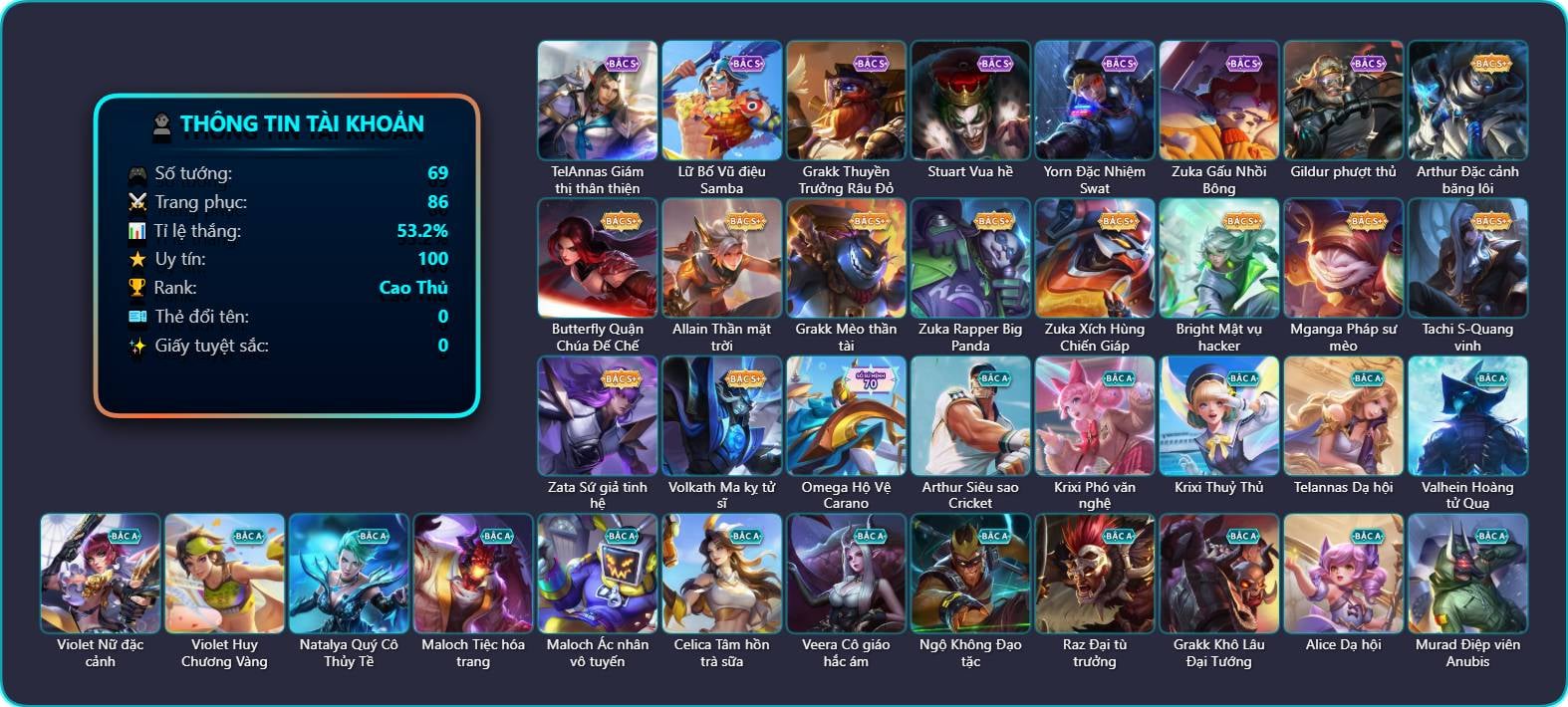 Valhein Hoàng tử Quạ, Valhein Số 7 Thần Sầu, Krixi Phó văn nghệ, Krixi Thuỷ Thủ, Veera Goá Phụ, Mganga Doombot Hủy Diệt, Taara Hỏa Ngọc Nữ Đế, Zephys Tư lệnh viễn chinh, Arduin Quang Vinh, Arduin Tà linh hiệp sỹ, Kriknak Bọ Cánh Bạc, Kriknak Yêu trùng cổ mộ, Max Quang Vinh, Zuka Đại Phú Ông, Zuka Gấu Nhồi Bông, Zuka Rapper Big Panda, Violet Nữ đặc cảnh, Violet Phi Công Trẻ, Violet Phó học tập, Violet Đặc Dị, Zill Lốc Địa Ngục, Zill Dung nham, Nakroth Chiến Binh Hỏa Ngục, Ngộ Không Đặc vụ băng hầu, Ngộ Không Nhóc tỳ bá đạo, Butterfly Cẩm y vệ_ Chu Tước, Butterfly Bình Minh Tận Thế, Florentino Giám sát tinh hệ, Florentino S-Quang Vinh, Grakk Khô Lâu Đại Tướng, KilGroth Cảnh Vệ Biển, Murad Thợ Săn Tiền Thưởng, Murad Thiên Tài Sân Cỏ, Murad S-Quang Vinh, Skud Sơn Tặc, Dirak Quý tộc, Keera Y tá lạ, Qi Tiểu long, Richter Bá tước, Richter Quang vinh 2.0, Fennik Nhà thám hiểm, Enzo Phẩm chất quý tộc, Hayate Bạch ảnh, Preyta Phi cơ F1, Lauriel Đọa Lạc Thiên Sứ, Lindis Đồng phục Shihakusho, Maloch Tiệc hóa trang, Cresht Cá Cắn Cáp, Capheny S-Quang Vinh, Aleister Quỷ soái nguyệt tộc, Airi Lễ hội mùa xuân, Roxie Lễ hội hoa, Roxie Hỏa thuật sư, Ryoma Đại Tướng Nguyệt Tộc, Amily Đặc công nhện đỏ, Amily Thư ký, Amily Hội ám hoàng, Zata Tư lệnh viễn chinh, Liliana Thuỷ thủ hồ ly, Raz Đại tù trưởng, Điêu Thuyền Mèo công nghệ, Azzenka Quang Vinh 2.0, Veres Chị đại học đường, Ata Quang vinh, Quillen Trưởng ngoại khoa, Kaine Thợ Săn Chính Nghĩa, Sephera Chiêm tinh gia, Telannas Dạ hội, TelAnnas Quang Vinh, Arthur Siêu sao Cricket, Jinna Hỏa nhãn ma vương, Annette Xứ sở thần tiên, Ignis Hỏa Thuật Sư