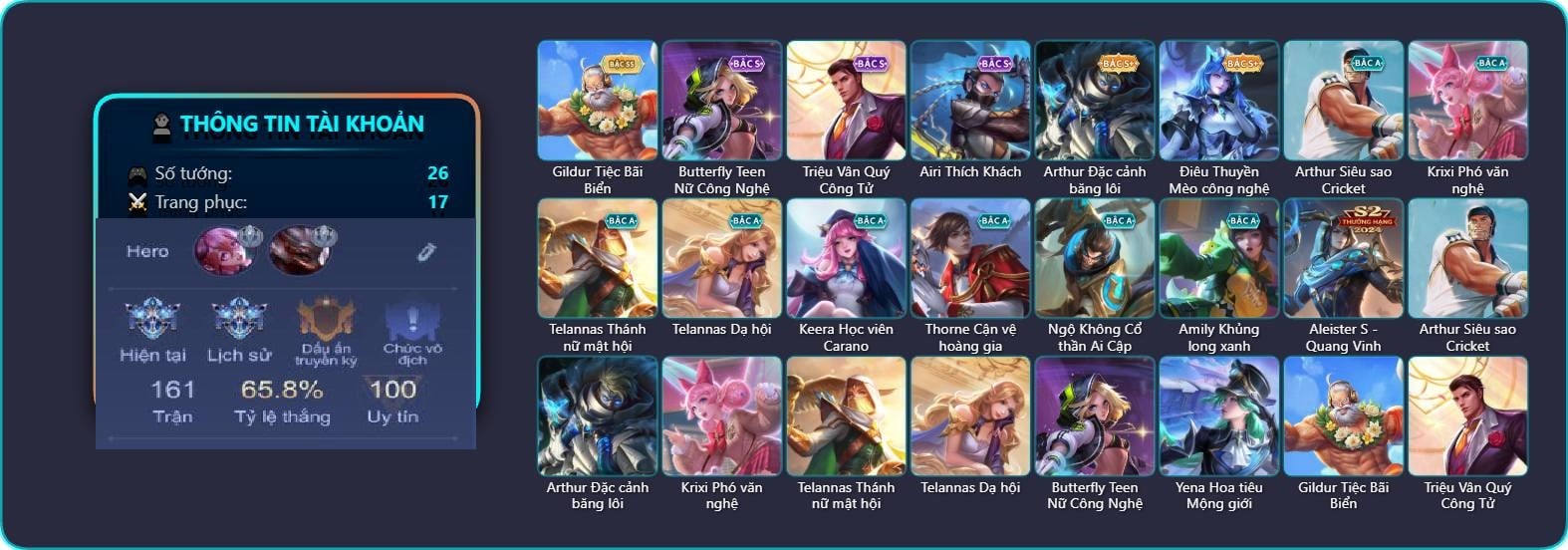 Arthur Siêu sao Cricket, Arthur Đặc cảnh băng lôi, Krixi Phó văn nghệ, Krixi Thuỷ Thủ, TelAnnas Giám thị thân thiện, Telannas Dạ hội, Violet Phó học tập, Violet Huy Chương Vàng, Butterfly Quận Chúa Đế Chế, Butterfly Bình Minh Tận Thế, Alice Dạ hội, Yorn Đặc Nhiệm Swat, Fennik Nhà thám hiểm, Baldum Liệt hỏa dung nham, Maloch Đại Tướng Robot, Stuart Vua hề, Mganga Quái tặc không gian, Mganga Doombot Hủy Diệt, Amily Nữ đội trưởng, Grakk Thuyền Trưởng Râu Đỏ, Grakk Mèo thần tài, Grakk Thần ẩm thực, Liliana Hồ Quý Phi, Ngộ Không Cổ thần Ai Cập, Airi Quản lý tài năng, Zill Thần mộng mị, Capheny S-Quang Vinh, Zephys Tư lệnh viễn chinh, Slimz Sứ giả Thiên giới, Slimz Siêu Cấp Tối Thượng, Zuka Gấu Nhồi Bông, Zuka Xích Hùng Chiến Giáp, Xeniel Trung Vệ Thép, Xeniel Kim sí điểu, Xeniel Shipper bánh mỳ, Celica S-Quang Vinh, Raz Đại tù trưởng, Tulen Dạ hội, Ryoma Thợ Săn Tiền Thưởng, Ryoma Đại Tướng Nguyệt Tộc, Ryoma Ailing Samurai, KilGroth Cảnh Vệ Biển, Hayate Bạch ảnh, Hayate Bạch lang, Tachi Đao khách vô tình, Teemee Tanuki chiêu tài, Omega Hộ Vệ Carano, Enzo Phẩm chất quý tộc, Florentino Vũ kiếm sư, Florentino S-Quang Vinh, Sephera Quý tiểu thư, Dirak Cảnh Vệ Bầu Trời, Kriknak Yêu trùng cổ mộ, Bijan Hoàng kim cơ giáp, Bijan Giai Điệu Giáng Sinh, Marja Linh Xà Tư Tế, Laville Tay súng diệt thần, Bonnie S Quang Vinh, Elsu Xạ Thần Mộng Giới, Ignis Vì sao con khóc, YBneth Chiến binh lục bảo, Ybneth Candy Bear, Yena Hoa tiêu Mộng giới, Aleister S - Quang Vinh, Teeri Minh Tinh Ảo Thuật