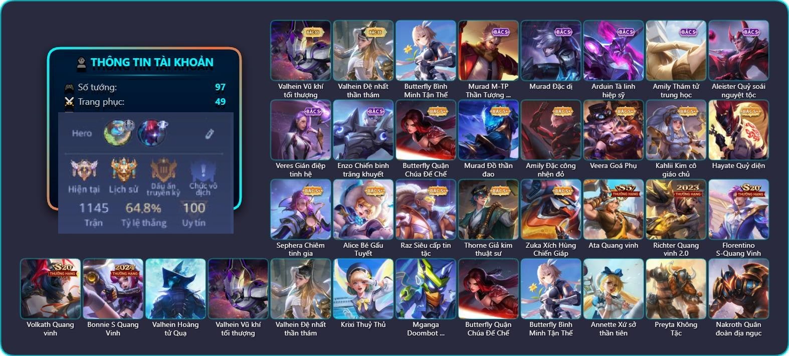 Arthur Siêu sao Cricket, Arthur Đặc cảnh băng lôi, Krixi Phó văn nghệ, TelAnnas Chung Tình Tiễn, Telannas Dạ hội, Valhein S-Quang Vinh, Butterfly Teen Nữ Công Nghệ, Violet Huy Chương Vàng, Triệu Vân Quý Công Tử, Natalya Quý Cô Thủy Tề, Zuka Rapper Big Panda, Omen Thuyền trưởng hải tặc, Điêu Thuyền Mèo công nghệ, Laville Xạ Thần Tinh Vệ, Grakk Thuyền Trưởng Râu Đỏ, Grakk Thần ẩm thực, Alice Dạ hội, Ngộ Không Cổ thần Ai Cập, Yorn Đặc Nhiệm Swat, Errol Stream đến bao giờ, Slimz Thỏ Thợ Mỏ, Slimz Sứ giả Thiên giới, Maloch Samurai Tử Sĩ, Gildur Đại gia học viện, Zata Tư lệnh viễn chinh, Enzo Phẩm chất quý tộc, Enzo Thần thoại Hy Lạp, Enzo Hồng hạc thị vệ, Lauriel Nữ vương học đường 2, Kahlii Tử điệp, Raz Đại tù trưởng, Murad S-Quang Vinh, Fennik Tay đua F1, Celica S-Quang Vinh, Yena Nữ hoàng thể thao, Annette Băng kỳ lâm, Quillen Đặc công mãng xà, Elandorr Siêu Thám Tử, Tachi Đao khách vô tình, Nakroth Producer Tia chớp