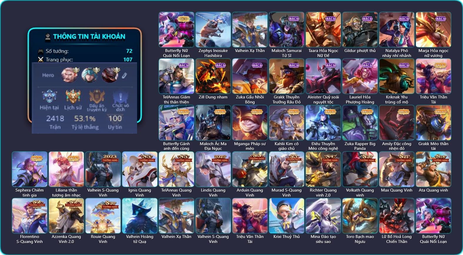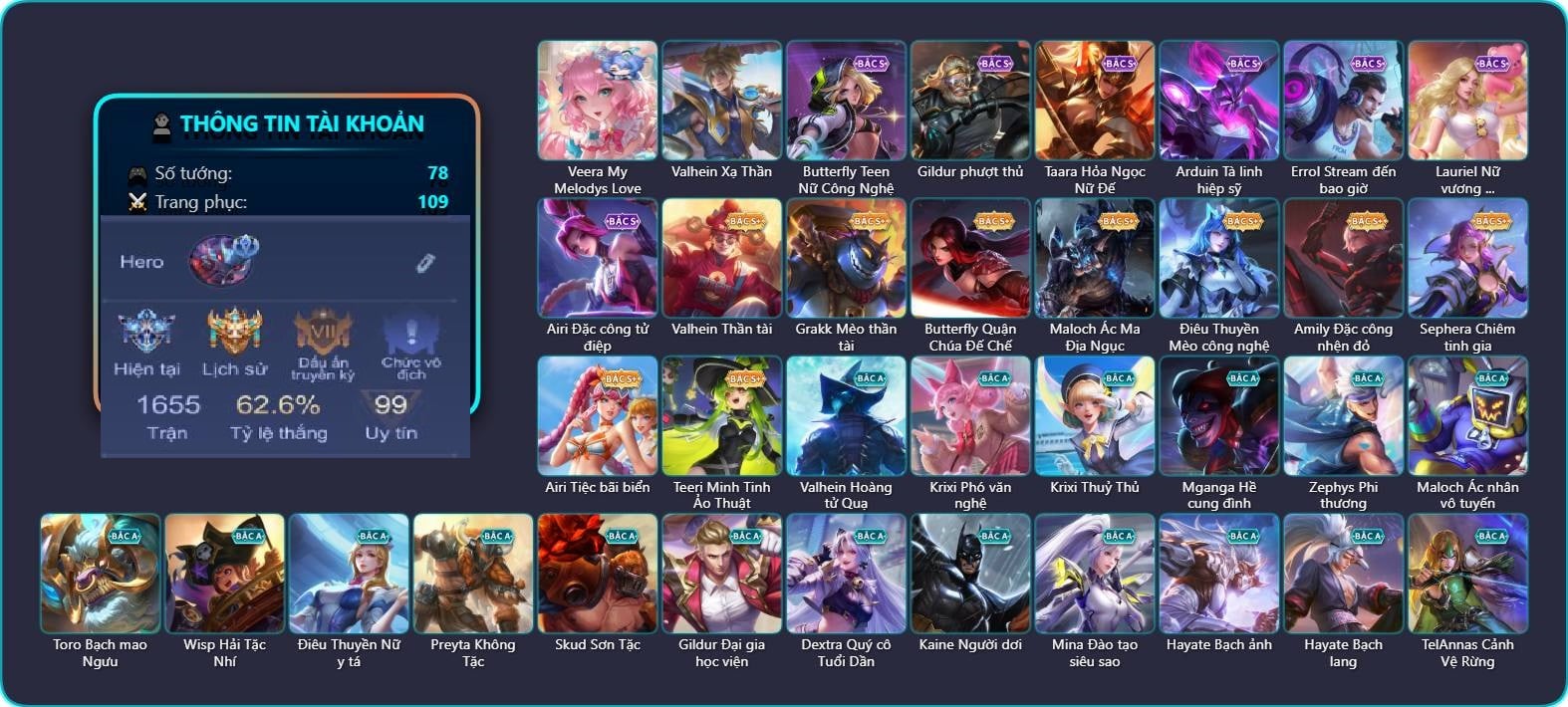 Valhein Hoàng tử Quạ, Valhein S-Quang Vinh, Triệu Vân Quý Công Tử, Krixi Phó văn nghệ, Krixi Thuỷ Thủ, Taara Hỏa Ngọc Nữ Đế, Fennik Nhà thám hiểm, Murad Thợ Săn Tiền Thưởng, Murad Điệp viên Anubis, Murad S-Quang Vinh, Ngộ Không Đạo tặc, Ngộ Không Cổ thần Ai Cập, Gildur phượt thủ, Gildur Đại gia học viện, Stuart Gã hề, Toro Đặc cảnh NYPD, Veera My Melodys Love, Mina Đào tạo siêu sao, Lữ Bố Nam Vương, Lữ Bố Vũ điệu Samba, Roxie Hầu gái, Natalya Nghệ nhân lân, Natalya Quý Cô Thủy Tề, Zephys Tư lệnh viễn chinh, Zephys Đầu bếp Sashimi, Preyta Không Tặc, Amily Đặc cảnh NYPD, Amily Nữ đội trưởng, Violet Nữ đặc cảnh, Violet Phó học tập, Violet Huy Chương Vàng, TelAnnas Cảnh Vệ Rừng, TelAnnas Giám thị thân thiện, Telannas Thánh nữ mật hội, Telannas Dạ hội, Tulen Dạ hội, Richter Dạ hội, Richter Cứu hộ, Arduin, Zuka Gấu Nhồi Bông, Zuka Đầu bếp hoàng cung, Lauriel Nữ vương học đường 2, Arthur Hoàng kim cốt, Arthur Siêu sao Cricket, Arthur Đặc cảnh băng lôi, Volkath Tư lệnh viễn chinh, Quillen Trưởng ngoại khoa, Errol Stream đến bao giờ, Zill Dung nham, Florentino Thần thoại Hy Lạp, Ryoma Thợ Săn Tiền Thưởng, Ryoma Đại Tướng Nguyệt Tộc, Ryoma Dạ hội, Ryoma Ailing Samurai, Maloch Ác Ma Địa Ngục, Maloch Samurai Tử Sĩ, Astrid Bạch Kiếm Tiểu Thư, Dextra Lữ khách cao nguyên, Liliana thần tượng âm nhạc, Yena Nữ hoàng thể thao, Lorion Chiến giáp hắc ám, Sephera Thủy Liên Hoa, Yan Giấc mơ sao, Celica S-Quang Vinh, Hayate Bạch lang, Baldum Đồ chơi, Aleister Thiếu Niên Hắc Ám, Aleister Xứ sở thần tiên, Aleister S - Quang Vinh, Raz Đại tù trưởng, Airi Quản lý tài năng, Annette Xứ sở thần tiên, Enzo Phẩm chất quý tộc, Enzo Thần thoại Hy Lạp, Enzo Nhà Leo núi, Slimz Thỏ Thợ Mỏ, Capheny S-Quang Vinh, Thorne Cận vệ hoàng gia, Alice Xứ sở thần tiên, Alice Dạ hội, Grakk Thần ẩm thực, Thane Kẻ Hủy Diệt, Keera Hồ điệp, Xeniel Trung Vệ Thép, Xeniel Kim sí điểu, Xeniel Shipper bánh mỳ, Omen Thuyền trưởng hải tặc, Ybneth Hạt trưởng kiểm lâm, Ishar Quận chúa sông Nile
