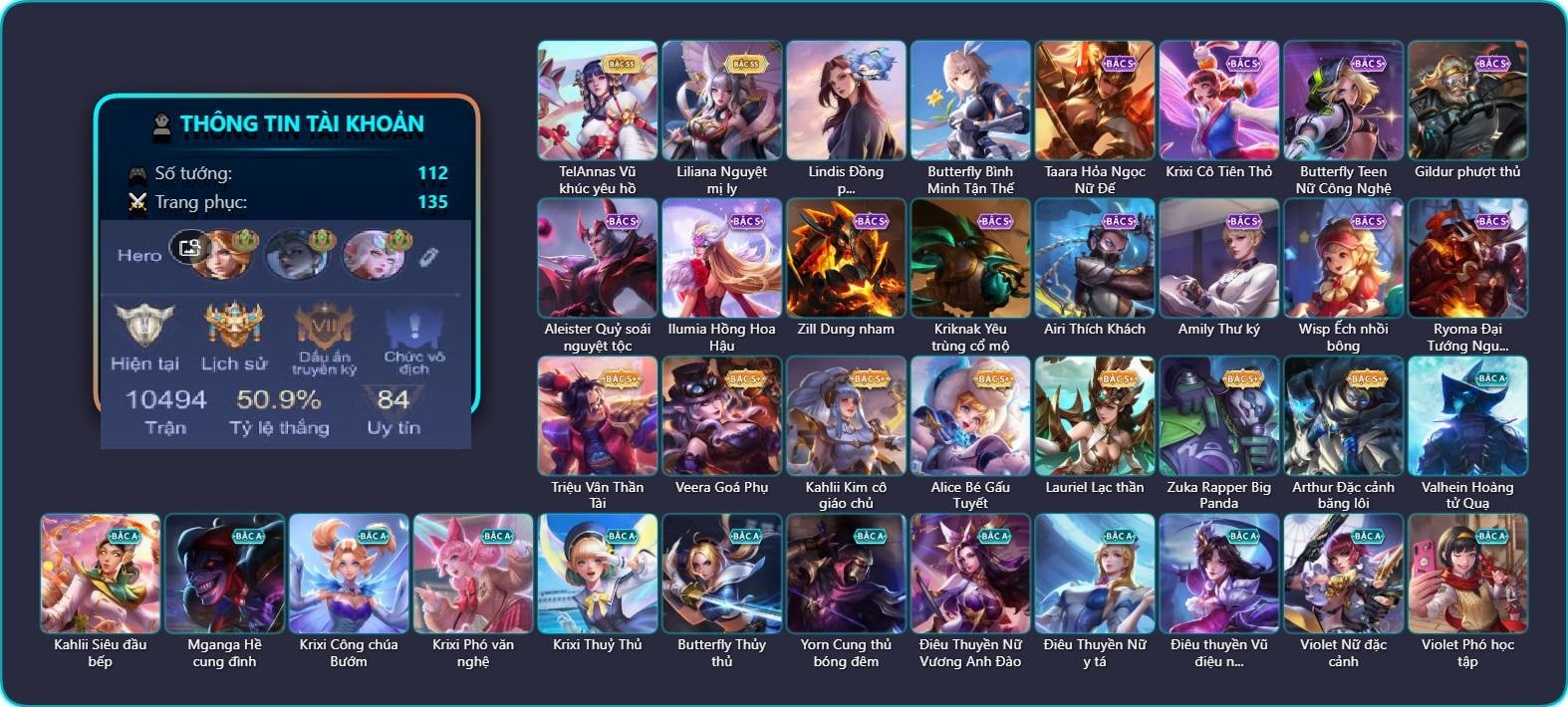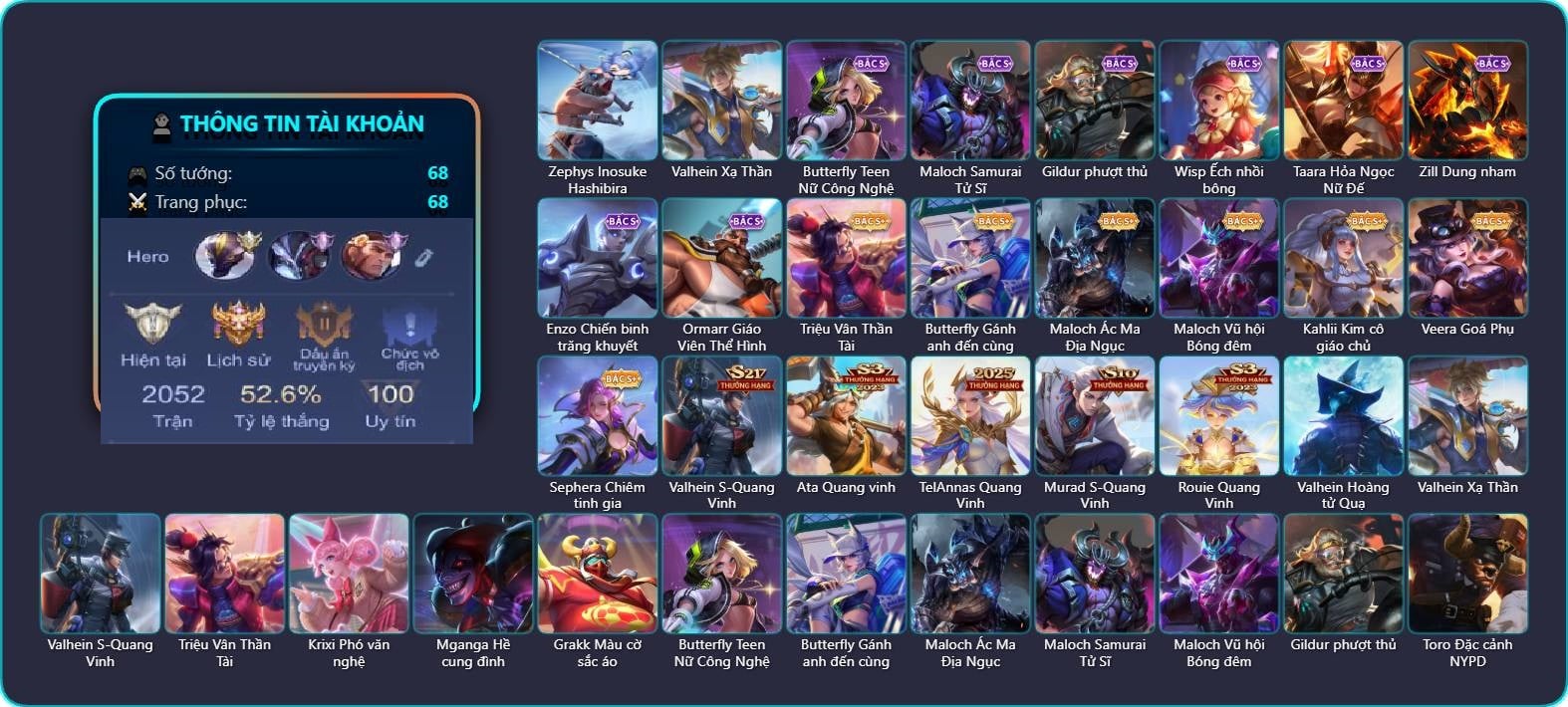 Valhein Hoàng tử Quạ, Valhein Số 7 Thần Sầu, Valhein Xạ Thần, Valhein S-Quang Vinh, Triệu Vân Kỵ sĩ tận thế, Krixi Phó văn nghệ, Krixi Thần Thoại Hy Lạp, Krixi Thuỷ Thủ, TelAnnas Cảnh Vệ Rừng, Telannas Dạ hội, TelAnnas Quang Vinh, Azzenka Quang Vinh 2.0, Gildur phượt thủ, Alice Xứ sở thần tiên, Grakk Thuyền Trưởng Râu Đỏ, Grakk Thần ẩm thực, Zephys Phi thương, Teemee Tay đua siêu tốc, Annette Xứ sở thần tiên, KilGroth Cảnh Vệ Biển, Fennik Tay đua F1, Hayate Bạch lang, Allain Lân sư Vũ thần, Preyta Phi cơ F1, Darcy Pháp sư hỏa long, Veera Goá Phụ, Violet Nữ đặc cảnh, Violet Phó học tập, Violet Đặc Dị, Violet Huy Chương Vàng, Laville Tay súng vô địch, Laville Kim quy thần vương, Quillen Trưởng ngoại khoa, Raz Đại tù trưởng, Raz Băng Quyền Quán Quân, Thane Kẻ Hủy Diệt, Airi Thích Khách, Airi Lễ hội mùa xuân, Zill Dung nham, Paine khúc nhạc tử vong, Dirak Quý tộc, Dirak Ông bầu Showbiz, Murad Thợ Săn Tiền Thưởng, Omega Hộ Vệ Carano, Ryoma Đại Tướng Nguyệt Tộc, Ata Quang vinh, Sephera Chiêm tinh gia, Amily Hội ám hoàng, Florentino S-Quang Vinh, Richter Quang vinh 2.0, Enzo Phẩm chất quý tộc, Yena Nữ hoàng thể thao, Qi Thiếu nữ pháo hoa, Lauriel Lạc thần, Ngộ Không Đạo tặc, Aleister Quỷ soái nguyệt tộc, Aya Điệp viên ký ức, Arthur Hoàng kim cốt, Arthur Siêu sao Cricket, Zuka Phát Tài, Zuka Gấu Nhồi Bông, Xeniel Thiên Sứ Hủy Diệt, Liliana Hồ Quý Phi, Omen Sĩ Quan Viễn Chinh, Sinestrea S-Quang vinh, Ilumia Nữ Chúa Tuyết