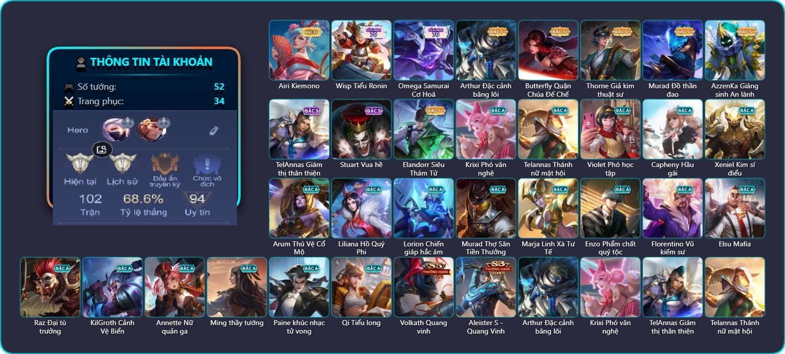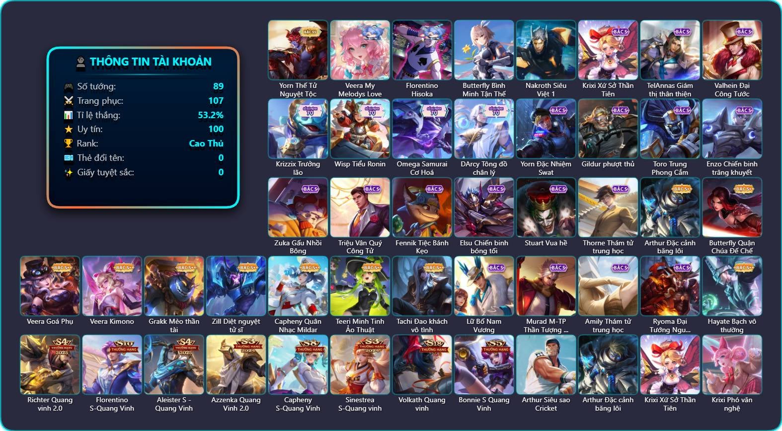 Valhein Vũ khí tối thượng, Valhein Số 7 Thần Sầu, Triệu Vân Cẩm y vệ Hỏa Long, Sephera Thủy Liên Hoa, Yena Nữ hoàng thể thao, Yena Hoa tiêu Mộng giới, Mganga Doombot Hủy Diệt, Darcy Pháp sư hỏa long, Zata Tư lệnh viễn chinh, Slimz Thỏ nhồi bông, Zuka Giáo Sư Sừng Sỏ, Zuka Gấu Nhồi Bông, Zuka Mãnh hổ, Zuka Xích Hùng Chiến Giáp, Max Trà Chanh, Hayate Bạch ảnh, Kaine Thợ Săn Chính Nghĩa, Enzo Phẩm chất quý tộc, Krixi Thần Thoại Hy Lạp, Florentino S-Quang Vinh, Errol Đêm Ác Mộng, Zill Dung nham, Zill Thần mộng mị, Kriknak Bọ Cánh Bạc, Airi Quản lý tài năng, Capheny S-Quang Vinh, Taara Shion, Grakk Thần ẩm thực, Ignis Vì sao con khóc, Thorne Thám tử trung học, Zephys Inosuke Hashibira, Telannas Thánh nữ mật hội, Telannas Dạ hội, Tel Annas Jujutsu Sorcerer, Arthur Lãnh chúa xương, Arthur Siêu sao Cricket, Annette Xứ sở thần tiên, Ngộ Không Cổ thần Ai Cập, Keera Hồ điệp, Xeniel Shipper bánh mỳ, Omen Sĩ Quan Viễn Chinh, Omen Quỷ nguyệt tướng, Omen Chiến binh trăng khuyết, Laville Tay đua đường phố, Laville Xạ Thần Tinh Vệ, KilGroth Cảnh Vệ Biển, KilGroth Chú lính chì, Raz Đại tù trưởng, Raz Mãnh lôi thần quyền, Thane Khoảnh khắc vinh quang, Bonnie S Quang Vinh, Tachi S-Vinh Quang, Elsu Xạ Thần Mộng Giới, Maloch Đại ca Mukbang, Bijan Giai Điệu Giáng Sinh, Teeri Minh Tinh Ảo Thuật, Ybneth Hạt trưởng kiểm lâm, Ybneth Candy Bear, Amily Thám tử trung học, Yan Nghệ nhân trung thu, Azzenka Ghẹo hay kẹo, Azzenka U Hồn Sa Mạc, Aleister S - Quang Vinh, Ryoma Đại Tướng Nguyệt Tộ