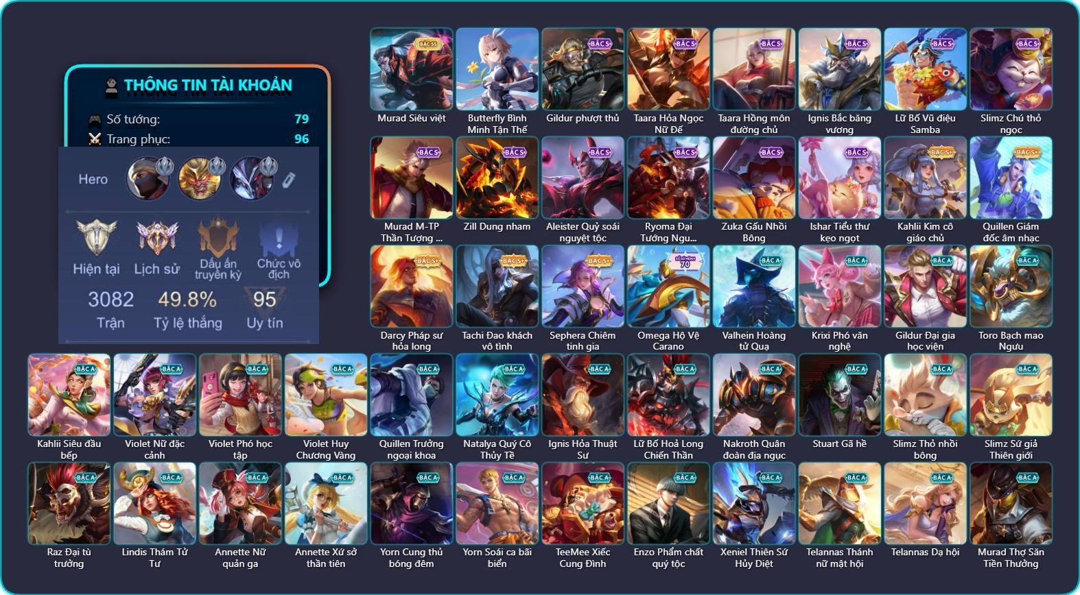 Valhein Hoàng tử Quạ, Valhein Đại Công Tước, Valhein Cá mập Nghiêm Túc, Valhein Thần tài, Valhein S-Quang Vinh, Triệu Vân Quý Công Tử, Triệu Vân Thần Tài, Krixi Công chúa Bướm, Krixi Phó văn nghệ, Veera Thiên nga đen, Veera My Melodys Love, Mganga Quái tặc không gian, Mganga Doombot Hủy Diệt, Yorn Cung thủ bóng đêm, Yorn Thần Thoại Hy Lạp, Gildur phượt thủ, Gildur Đại gia học viện, Azzenka Quang Vinh 2.0, AzzenKa Giáng sinh An lành, Azzenka U Hồn Sa Mạc, Lindis Thám Tử Tư, Lindis Quang Vinh, Lindis Đồng phục Shihakusho, Taara Hỏa Ngọc Nữ Đế, Taara Shion, Natalya Quý Cô Thủy Tề, Violet Nữ đặc cảnh, Violet Phó học tập, Violet Đặc Dị, Xeniel Kim sí điểu, Wisp Hải Tặc Nhí, Wisp Ếch nhồi bông, Wisp Máy phát quà, Điêu Thuyền Nữ y tá, Nakroth Chiến Binh Hỏa Ngục, Fennik Nhà thám hiểm, Zephys Phi thương, Zill Lốc Địa Ngục, Zill Dung nham, Zill Thần mộng mị, Elandorr Soái tặc, Murad Thợ Săn Tiền Thưởng, Murad Siêu việt, Murad S-Quang Vinh, Elsu Xạ Thần Mộng Giới, Arthur Hoàng kim cốt, Arthur Siêu sao Cricket, Arthur Đặc cảnh băng lôi, Hayate Bạch ảnh, Hayate Quỷ diện, Hayate Bạch vô thường, Hayate Bóng người dưới trăng, Volkath Quang vinh, Veres Đạo tặc, Qi Thiếu nữ pháo hoa, Richter Quang vinh 2.0, Errol Vượt ngục, Errol Đêm Ác Mộng, Florentino Vũ kiếm sư, Florentino Kiếm sĩ Olympic, Florentino Thần thoại Hy Lạp, Florentino S-Quang Vinh, Max Quang Vinh, Max Tiểu King Kong, Airi Ninja Xanh Lá, Airi Đặc công tử điệp, Airi Lễ hội mùa xuân, Airi Quản lý tài năng, KilGroth Cảnh Vệ Biển, Enzo Thần thoại Hy Lạp, Ryoma Thợ Săn Tiền Thưởng, Ryoma Đại Tướng Nguyệt Tộc, Ryoma Dạ hội, TelAnnas Cảnh Vệ Rừng, TelAnnas Giám thị thân thiện, TelAnnas Chung Tình Tiễn, Telannas Thánh nữ mật hội, Telannas Dạ hội, TelAnnas Quang Vinh, Tel Annas Jujutsu Sorcerer, Arduin Quang Vinh, Zuka Đại Phú Ông, Zuka Phát Tài, Zuka Gấu Nhồi Bông, Zuka Đầu bếp hoàng cung, Zuka Rapper Big Panda, Quillen Trưởng ngoại khoa, Ybneth Candy Bear, Zip Cá siêu quậy, Yena Hoa tiêu Mộng giới, Slimz Thỏ Thợ Mỏ, Slimz Thỏ nhồi bông, Dirak Cảnh Vệ Bầu Trời, Dirak Quý tộc, Keera Nghệ sĩ Graffiti, Butterfly Thủy thủ, Teemee Tay đua siêu tốc, Laville Tay đua đường phố, Laville Tay súng diệt thần, Laville Tay súng vô địch, Preyta Băng Hỏa Long Sư, Preyta Phi cơ F1, Ishar Capoo Boom, Sephera Phi vụ thế kỷ, Caesar Bão tố, Thorne Thám tử trung học, Amily Đặc công nhện đỏ, Amily Hội ám hoàng, Amily Thám tử trung học, Tulen Phù Thủy Kiến Tạo, Raz Đại tù trưởng, Aleister Quỷ soái nguyệt tộc, Aleister S - Quang Vinh, Arum Thú Vệ Cổ Mộ, Arum Nữ hoàng gấu xám, Bright Kỳ Lân Soái, Dextra Quý cô Tuổi Dần, Omen Sĩ Quan Viễn Chinh, Lauriel Đọa Lạc Thiên Sứ, Grakk Khô Lâu Đại Tướng, Capheny Hầu gái, Yan Nghệ nhân trung thu, Roxie Lễ hội hoa, Roxie Hỏa thuật sư, Maloch Ác Ma Địa Ngục, Maloch Samurai Tử Sĩ, Maloch Đại ca Mukbang, Aya Điệp viên ký ức, Teeri Minh Tinh Ảo Thuật, Annette Xứ sở thần tiên, Liliana Hồ Quý Phi, Liliana Thuỷ thủ hồ ly, Sinestrea S-Quang vinh, Marja Linh Xà Tư Tế, Bonnie S Quang Vinh, Bijan Giai Điệu Giáng Sinh, Ignis Vì sao con khóc
