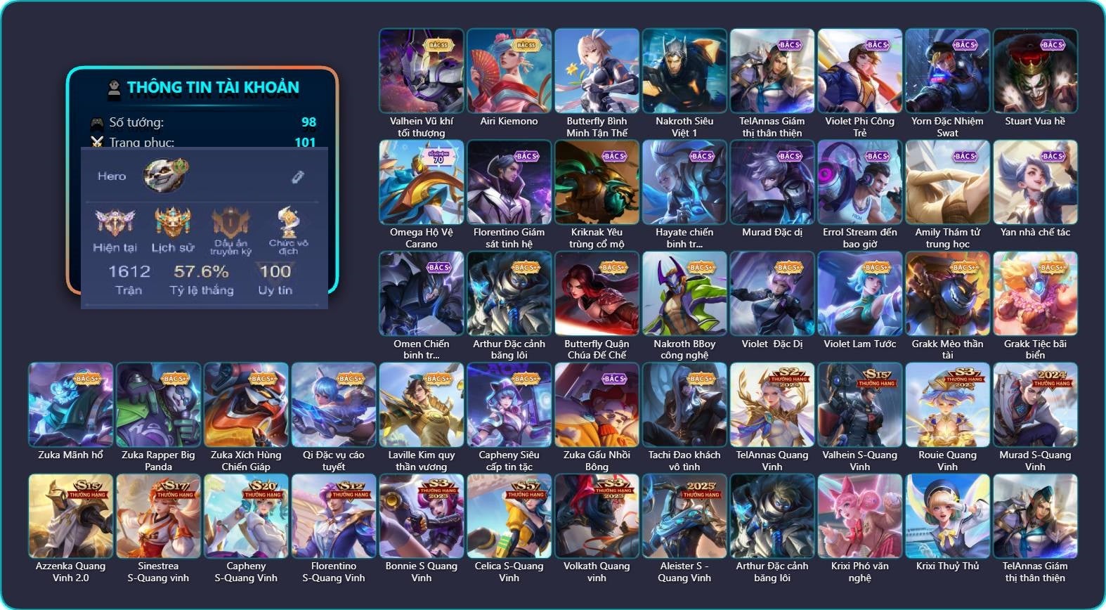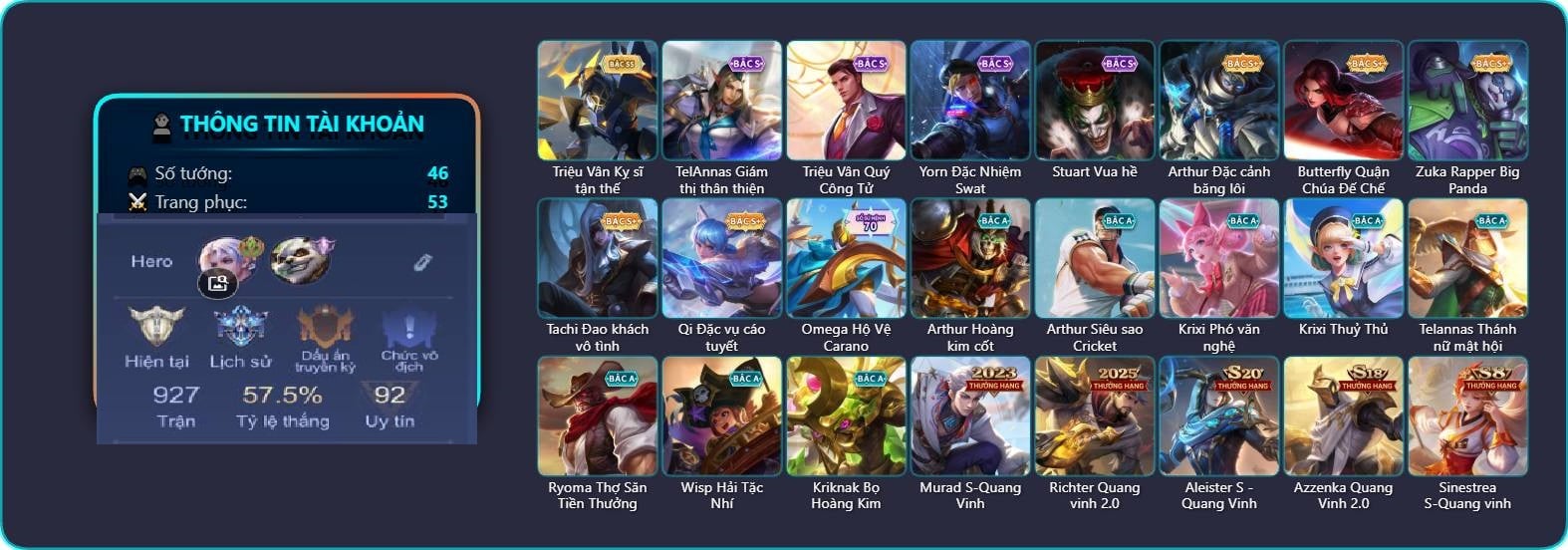 Valhein Hoàng tử Quạ, Valhein Quang Vinh, Triệu Vân Quang Vinh, Mganga Doombot Hủy Diệt, Toro Đặc cảnh NYPD, Toro Ngưu hải vương, Krixi Phó văn nghệ, Violet Phó học tập, Violet Tay Súng Siêu Phẩm, Zill Dung nham, Kahlii Tử điệp, AzzenKa Giáng sinh An lành, Azzenka U Hồn Sa Mạc, Aleister Quang Vinh, Chaugnar Quang Vinh, Telannas Thánh nữ mật hội, Omen Sĩ Quan Viễn Chinh, Natalya Quý Cô Thủy Tề, Astrid Bạch Kiếm Tiểu Thư, Tulen Dạ hội, KilGroth Cảnh Vệ Biển, KilGroth Quang Vinh, Maloch Tiệc hóa trang, Butterfly Teen Nữ Công Nghệ, Airi Thích Khách, Alice Bé Gấu Tuyết, Alice Xứ sở thần tiên, Ignis Quang Vinh, Taara Hỏa Ngọc Nữ Đế, Lindis Thám Tử Tư, Lindis Quang Vinh, Amily Đặc cảnh NYPD, Amily Hội ám hoàng, Ilumia Thiên nữ áo dài, Mina Tiểu thư đoạt hồn, Mina Tiệc Bánh Kẹo, Veera Goá Phụ, Arduin, Arduin Quang Vinh, Arduin Tà linh hiệp sỹ, Liliana Hồ Quý Phi, Xeniel Thiên Sứ Hủy Diệt, Murad Thợ Săn Tiền Thưởng, Murad Điệp viên Anubis, Marja Linh Xà Tư Tế, Capheny Hầu gái, Max Quang Vinh, Teemee Tay đua siêu tốc, Arthur Hoàng kim cốt, Arthur Siêu sao Cricket, Volkath Xung thiên thần tướng, Volkath Quang vinh, Krizzix Crursed Corpse, Ishar Giấc Mơ Ngọt Ngào, Zuka Gấu Nhồi Bông, Preyta Phi cơ F1, Wisp Hải Tặc Nhí, Sinestrea S-Quang vinh, Ryoma Đại Tướng Nguyệt Tộc, Laville Tay đua đường phố, Laville Tay súng vô địch, Omega Hộ vệ ba bích, Omega Hộ Vệ Carano, Ata Quang vinh, Thorne Thám tử trung học, Ybneth Hạt trưởng kiểm lâm, Lorion Chiến giáp hắc ám, Bright Soái ca thánh điện, Bright Kỳ Lân Soái, Dolia Môn đồ tập sự, Allain Lân sư Vũ thần, Bonnie S Quang Vinh|