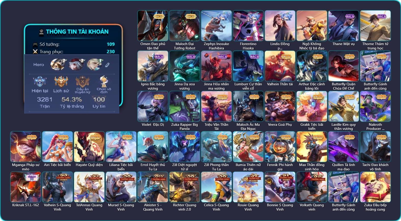 Valhein Hoàng tử Quạ, Valhein Đại Công Tước, Valhein Số 7 Thần Sầu, Valhein Thần tài, Valhein S-Quang Vinh, TelAnnas Giám thị thân thiện, Telannas Dạ hội, TelAnnas Quang Vinh, Arthur Hoàng kim cốt, Arthur Lãnh chúa xương, Arthur Siêu sao Cricket, Arthur Đặc cảnh băng lôi, Butterfly Teen Nữ Công Nghệ, Butterfly Quận Chúa Đế Chế, Butterfly Gánh anh đến cùng, Violet Nữ đặc cảnh, Violet Phi Công Trẻ, Violet Phó học tập, Violet Đặc Dị, Violet Tay Súng Siêu Phẩm, Violet Huy Chương Vàng, Krixi Phó văn nghệ, Zuka Đại Phú Ông, Zuka Giáo Sư Sừng Sỏ, Zuka Phát Tài, Zuka Gấu Nhồi Bông, Zuka Đầu bếp hoàng cung, Zuka Rapper Big Panda, Zephys Phi thương, Zephys Inosuke Hashibira, Natalya Quý Cô Thủy Tề, Alice Xứ sở thần tiên, Alice The Butterfly Mansion Girl, Omen Đao phủ tận thế, Omen Thuyền trưởng hải tặc, Lữ Bố Kỵ Sĩ Âm Phủ, Lữ Bố Đặc Nhiệm Swat, Triệu Vân Quý Công Tử, Triệu Vân Thần Tài, Allain Lân sư Vũ thần, Maloch Ác Ma Địa Ngục, Maloch Đại Tướng Robot, Maloch Ác nhân vô tuyến, Veera Goá Phụ, Stuart Trò đùa tử vong, Stuart Vua hề, Stuart Gã hề, Grakk Thuyền Trưởng Râu Đỏ, Grakk Khô Lâu Đại Tướng, Grakk Tiệc bãi biển, Grakk Thần ẩm thực, Yorn Đặc Nhiệm Swat, Yorn Soái ca bãi biển, Qi Tiểu long, Qi Quán quân, Qi Thiếu nữ pháo hoa, Qi Blogger Ẩm thực, Ngộ Không Đạo tặc, Ngộ Không Nhóc tỳ bá đạo, Ngộ Không Cổ thần Ai Cập, Kriknak Bọ Cánh Bạc, Kriknak ST.L-162, Mina Tiểu thư đoạt hồn, Mina Đào tạo siêu sao, Laville Tay đua đường phố, Laville Kim quy thần vương, Laville Thám tử học đường, Kahlii Siêu đầu bếp, Kahlii Tử điệp, Florentino Vũ kiếm sư, Florentino Kiếm sĩ Olympic, Florentino Thần thoại Hy Lạp, Florentino Hisoka, Nakroth Quán quân, Nakroth Producer Tia chớp, Omega Người máy xanh, Omega Cỗ Máy Siêu Tốc, Omega Hộ vệ ba bích, Ybneth Hạt trưởng kiểm lâm, Ybneth Candy Bear, Bright Soái ca thánh điện, Bright Kỳ Lân Soái, Gildur phượt thủ, Gildur Đại gia học viện, Mganga Hề cung đình, Mganga Pháp sư mèo, Mganga Doombot Hủy Diệt, Toro Bạch mao Ngưu, Toro Ngưu hải vương, Dextra Quý cô Tuổi Dần, Murad Thợ Săn Tiền Thưởng, Murad M-TP Thần Tượng Học Đường, Murad Điệp viên Anubis, Murad S-Quang Vinh, Lindis Thám Tử Tư, Lindis Đồng phục Shihakusho, Airi Thích Khách, Airi Ninja Xanh Lá, Airi Tiệc bãi biển, Airi Đặc công tử điệp, Hayate Bạch ảnh, Hayate Quỷ diện, Hayate Bạch lang, Astrid Bạch Kiếm Tiểu Thư, Tulen Nhà Thám Hiểm, Tulen Phù Thủy Kiến Tạo, Tulen Đông êm đềm, Tulen Dạ hội, Aleister Thiếu Niên Hắc Ám, Aleister Quỷ soái nguyệt tộc, Aleister Xứ sở thần tiên, Aleister S - Quang Vinh, Aoi Hoàng kim công chúa, Aoi Tiệc bãi biển, Enzo Phẩm chất quý tộc, Enzo Chiến binh trăng khuyết, Enzo Thần thoại Hy Lạp, Enzo Nhà Leo núi, Elandorr Phi vụ thế kỷ, Elandorr Học viện Carano, Liliana Hồ Quý Phi, Liliana Tiệc bãi biển, Liliana Thuỷ thủ hồ ly, Veres Thần thoại Hy Lạp, Elsu Mafia, Elsu Xạ Thần Mộng Giới, Lauriel Đọa Lạc Thiên Sứ, Lauriel Hỏa Phượng Hoàng, Lauriel Nữ vương học đường 2, Richter Bá tước, Richter Dạ hội, Richter Quang vinh 2.0, Roxie Thám tử tập sự, Roxie Lễ hội hoa, Errol Vượt ngục, Errol Huyết thủ Tu La, Errol Stream đến bao giờ, Wisp Hải Tặc Nhí, Wisp Ếch nhồi bông, Wisp Rồng đi bộ, Ata Mèo đi mưa, Ryoma Thợ Săn Tiền Thưởng, Ryoma Đại Tướng Nguyệt Tộc, Ryoma Dạ hội, Taara Đại tù trưởng, Taara Hỏa Ngọc Nữ Đế, Thane Kẻ Hủy Diệt, Thane Mật vụ, Zill Diệt nguyệt tử sĩ, Zill Phong thần Tu La, Yue Tiểu công Chúa, Slimz Xứ sở thần tiên, Slimz Sứ giả Thiên giới, Slimz Siêu Cấp Tối Thượng, Capheny Hầu gái, Raz Đại tù trưởng, Ilumia Thiên nữ áo dài, Ilumia Diva nổi loạn, Ilumia Ngược dòng thời gian, Moren Anh thợ điện, Fennik Nhà thám hiểm, Fennik Đội đặc nhiệm, Fennik Phi hành gia, Fennik Shipper Siêu thanh, Celica Nữ cao bồi, Celica S-Quang Vinh, Max Hiệp Sĩ Nhí, Max Găng Tay Vàng, Max Thần đồng sinh hóa, Thorne Cận vệ hoàng gia, Thorne Thám tử trung học, Xeniel Thiên Sứ Hủy Diệt, Xeniel Kim sí điểu, Iggy Tiểu Hoàng Đế, Iggy Bạch hồ ly, Ignis Hỏa Thuật Sư, Ignis Bắc băng vương, Ignis Nguyệt lão, Preyta Không Tặc, Ormarr Cựu chiến binh, Yena Nữ hoàng thể thao, Yena Nữ cướp biển, Yena Hoa tiêu Mộng giới, Rouie Quang Vinh, Arduin, Quillen Trưởng ngoại khoa, Quillen Tà linh ma đao, Kaine Người dơi, Jinna Đại Tư Tế, Jinna Dạ xoa vương, Jinna Hỏa nhãn ma vương, Tachi Lãng khách, Tachi Đao khách vô tình, Bonnie S Quang Vinh, Zata Tư lệnh viễn chinh, Zata Thần mặt trời, Amily Nữ đội trưởng, Sephera Phi vụ thế kỷ, Sephera Thủy Liên Hoa, Keera Học viên Carano, Keera Nghệ sĩ Graffiti, Baldum chú thợ ống nước, Arum Thú Vệ Cổ Mộ, Arum Thần tượng nhạc Rock, Volkath Tư lệnh viễn chinh, Volkath Quang vinh, Dirak Cảnh Vệ Bầu Trời, Dirak Đường chủ yêu giới, Lorion Chiến giáp hắc ám, KilGroth Cảnh Vệ Biển, KilGroth Càn Nguyên Thủ Vệ, Lumburr Dung Nham, Lumburr Cự thần viễn cổ, Aya Hoạt náo viên, Cresht Thợ sửa cáp, Caesar Bão tố, Sinestrea Giấc mơ trưa, Sinestrea S-Quang vinh, TeeMee Xiếc Cung Đình, Teemee Thịt xiên nướng, Điêu Thuyền Nữ Vương Anh Đào, Điêu Thuyền Nữ y tá, 