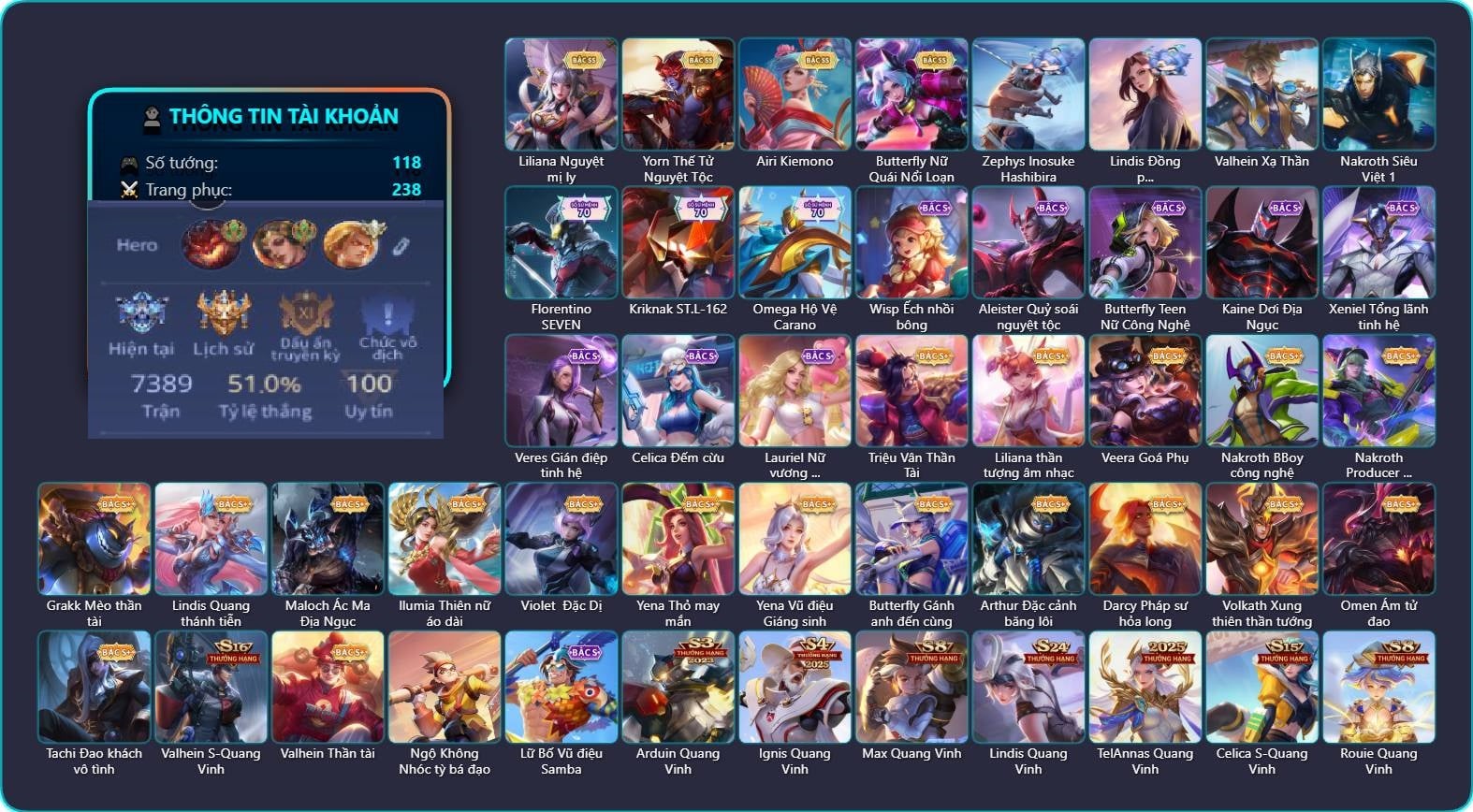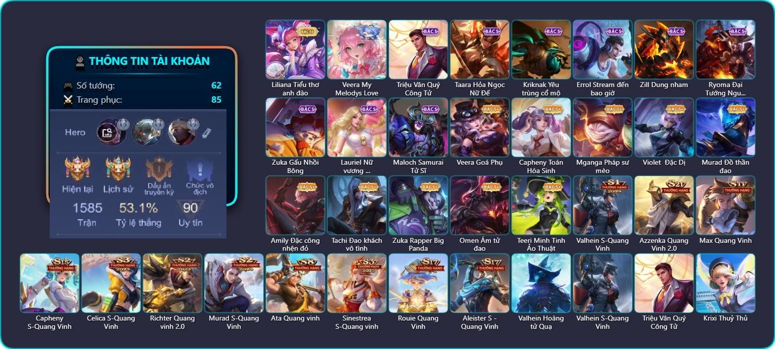 Valhein Hoàng tử Quạ, Valhein S-Quang Vinh, Triệu Vân Quý Công Tử, Krixi Thuỷ Thủ, Veera Goá Phụ, Veera My Melodys Love, Natalya Quý Cô Thủy Tề, Azzenka Quang Vinh 2.0, Quillen Trưởng ngoại khoa, Taara Hỏa Ngọc Nữ Đế, Alice Xứ sở thần tiên, Gildur Đại gia học viện, Kahlii Tử điệp, Max Hiệp Sĩ Nhí, Max Quang Vinh, Capheny Toán Hóa Sinh, Capheny S-Quang Vinh, Kriknak Bọ Cánh Bạc, Kriknak Yêu trùng cổ mộ, Kriknak Bọ Hoàng Kim, Preyta Phi cơ F1, Hayate Bạch lang, Slimz Siêu Cấp Tối Thượng, Celica S-Quang Vinh, Errol Stream đến bao giờ, Mganga Pháp sư mèo, Zephys Phi thương, Violet Nữ đặc cảnh, Violet Phó học tập, Violet Đặc Dị, Violet Huy Chương Vàng, Zill Dung nham, Zill Thần mộng mị, Dirak Quý tộc, Ryoma Thợ Săn Tiền Thưởng, Ryoma Đại Tướng Nguyệt Tộc, Richter Quang vinh 2.0, Murad Thợ Săn Tiền Thưởng, Murad Đồ thần đao, Murad Thiên Tài Sân Cỏ, Murad Điệp viên Anubis, Murad S-Quang Vinh, Zata Tư lệnh viễn chinh, Ata Quang vinh, Tulen Dạ hội, Sinestrea Lữ khách sa mạc, Sinestrea S-Quang vinh, Qi Tiểu long, Qi Thiếu nữ pháo hoa, Amily Đặc công nhện đỏ, Raz Đại tù trưởng, Teemee Thịt xiên nướng, TelAnnas Chung Tình Tiễn, Telannas Thánh nữ mật hội, Telannas Dạ hội, Arthur Siêu sao Cricket, Rouie Quang Vinh, Tachi Đao khách vô tình, Zuka Gấu Nhồi Bông, Zuka Đầu bếp hoàng cung, Zuka Rapper Big Panda, Grakk Thần ẩm thực, Lauriel Nữ vương học đường 2, Bijan Giai Điệu Giáng Sinh, Ngộ Không Cổ thần Ai Cập, Airi Quản lý tài năng, Annette Xứ sở thần tiên, Elsu Cảnh vệ thảo nguyên, Maloch Samurai Tử Sĩ, Maloch Ác nhân vô tuyến, Maloch Đại ca Mukbang, Dextra Quý cô Tuổi Dần, Dextra Lữ khách cao nguyên, Liliana Tiểu thơ anh đào, Liliana Thuỷ thủ hồ ly, Omen Sĩ Quan Viễn Chinh, Omen Ám tử đao, Thorne Cận vệ hoàng gia, Xeniel Trung Vệ Thép, Xeniel Kim sí điểu, Lorion Chiến giáp hắc ám, Teeri Minh Tinh Ảo Thuật, Aleister S - Quang Vinh, Ormarr CĐV Cuồng nhiệt, Caesar Bão tố