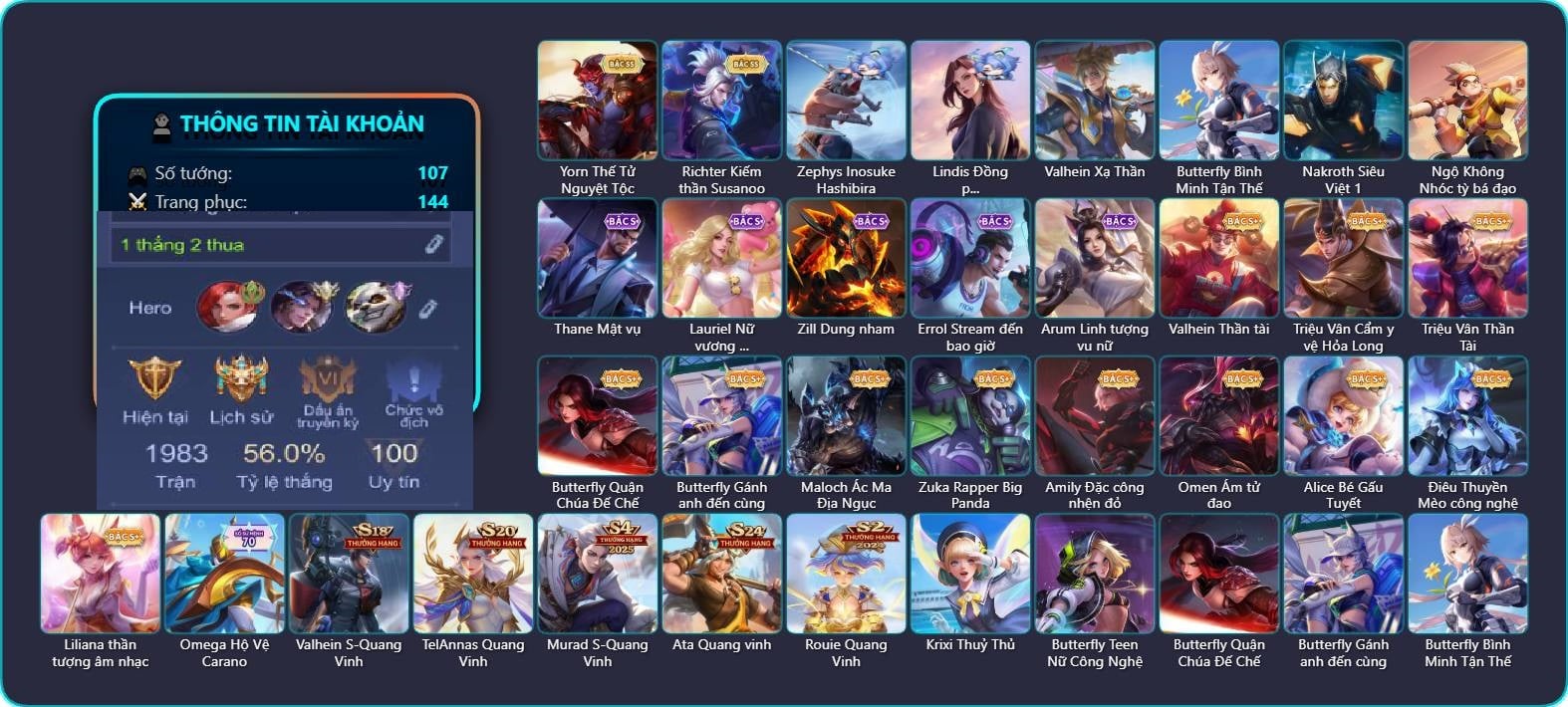 Valhein Hoàng tử Quạ, Valhein Xạ Thần, Valhein S-Quang Vinh, Triệu Vân Quý Công Tử, Krixi Công chúa Bướm, Krixi Phó văn nghệ, Krixi Thần Thoại Hy Lạp, Krixi Thuỷ Thủ, Veera Goá Phụ, Veera Thiên nga đen, Toro Đặc cảnh NYPD, Toro Bạch mao Ngưu, Yorn Cung thủ bóng đêm, Yorn Soái ca bãi biển, Gildur phượt thủ, Gildur Đại gia học viện, Mganga Hề cung đình, Mganga Doombot Hủy Diệt, Kahlii Siêu đầu bếp, Taara Đại tù trưởng, Taara Hỏa Ngọc Nữ Đế, Taara Tư lệnh hải âu, Alice Xứ sở thần tiên, Alice Dạ hội, KilGroth Cảnh Vệ Biển, KilGroth Quang Vinh, Slimz Thỏ Thợ Mỏ, Slimz Thỏ nhồi bông, Slimz Sứ giả Thiên giới, Zephys Oán linh, Zephys Phi thương, Zephys Tư lệnh viễn chinh, Zephys Inosuke Hashibira, Natalya Quý Cô Thủy Tề, Liliana Hồ Quý Phi, Liliana Thuỷ thủ hồ ly, Jinna Đại Tư Tế, Azzenka Quang Vinh 2.0, Azzenka U Hồn Sa Mạc, Wisp Hải Tặc Nhí, Violet Nữ đặc cảnh, Violet Phi Công Trẻ, Violet Phó học tập, Violet Đặc Dị, Violet Tay Súng Siêu Phẩm, Violet Huy Chương Vàng, Điêu Thuyền Nữ Vương Anh Đào, Điêu Thuyền Mèo công nghệ, Lindis Thám Tử Tư, Skud Quang Vinh, Ilumia Nữ Chúa Tuyết, Ilumia Thiên nữ áo dài, Ilumia Diva nổi loạn, Raz Đại tù trưởng, Raz Saitama Cosplay, Tulen Nhà Thám Hiểm, Tulen Dạ hội, Thane Kẻ Hủy Diệt, Thane Khoảnh khắc vinh quang, Ignis Hỏa Thuật Sư, Ignis Quang Vinh, TelAnnas Cảnh Vệ Rừng, Telannas Thánh nữ mật hội, Telannas Dạ hội, TelAnnas Quang Vinh, Sephera Quý tiểu thư, Sephera Chiêm tinh gia, Sephera Phi vụ thế kỷ, Zuka Đại Phú Ông, Zuka Gấu Nhồi Bông, Zuka Đầu bếp hoàng cung, Zuka Xích Hùng Chiến Giáp, Arduin, Arduin Quang Vinh, Arduin Tà linh hiệp sỹ, Ybneth Hạt trưởng kiểm lâm, Grakk Khô Lâu Đại Tướng, Grakk Màu cờ sắc áo, Kaine Đôi Cánh Đại Dương, Elsu Mafia, Cresht Thợ sửa cáp, Max Quang Vinh, Max Trà Chanh, TeeMee Xiếc Cung Đình, Teemee Tay đua siêu tốc, Omen Sĩ Quan Viễn Chinh, Richter Dạ hội, Veres Đạo tặc, Hayate Bạch ảnh, Hayate Bạch lang, Kriknak Bọ Cánh Bạc, Arthur Hoàng kim cốt, Arthur Siêu sao Cricket, Arthur Đặc cảnh băng lôi, Ryoma Thợ Săn Tiền Thưởng, Ryoma Đại Tướng Nguyệt Tộc, Ryoma Dạ hội, Moren Anh thợ điện, Zill Lốc Địa Ngục, Zill Dung nham, Zill Thần mộng mị, Elandorr Phi vụ thế kỷ, Elandorr Học viện Carano, Celica S-Quang Vinh, Capheny Thần tượng âm nhạc, Capheny S-Quang Vinh, Yena Khuyên Bạc, Yena Hoạt náo viên, Yena Nữ hoàng thể thao, Yena Nữ cướp biển, Rouie Quang Vinh, Baldum chú thợ ống nước, Baldum thần thoại hy lạp, Baldum Đồ chơi, Rourke Pháo Thủ Tuộc Neo, Rourke Cuồng tặc, Lumburr Dung Nham, Laville Tay súng vô địch, Fennik Nhà thám hiểm, Fennik Đội đặc nhiệm, Fennik Tay đua F1, Preyta Không Tặc, Preyta Phi cơ F1, Allain Lân sư Vũ thần, Darcy Pháp sư hỏa long, Amily Đặc cảnh NYPD, Amily Đặc công nhện đỏ, Amily Hội ám hoàng, Qi Thiếu nữ pháo hoa, Qi Blogger Ẩm thực, Ngộ Không Đạo tặc, Ngộ Không Tề Thiên ma hầu, Ngộ Không Cổ thần Ai Cập, Dirak Quý tộc, Dirak Ông bầu Showbiz, Aleister S - Quang Vinh, Errol Vượt ngục, Roxie Thám tử tập sự, Keera Học viên Carano, Keera Thuỷ thủ, Volkath Tư lệnh viễn chinh, Volkath Quang vinh, Murad Thợ Săn Tiền Thưởng, Murad Thiên Tài Sân Cỏ, Florentino S-Quang Vinh, Arum Nữ hoàng gấu xám, Airi Lễ hội mùa xuân, Maloch Ác Ma Địa Ngục, Nakroth Quân đoàn địa ngục, Butterfly Teen Nữ Công Nghệ, Ata Quang vinh, Ata Mèo đi mưa, Ishar Giấc Mơ Ngọt Ngào, Enzo Phẩm chất quý tộc, Annette Xứ sở thần tiên, Marja Linh Xà Tư Tế, Lauriel Đọa Lạc Thiên Sứ, Xeniel Thiên Sứ Hủy Diệt, Bonnie S Quang Vinh|