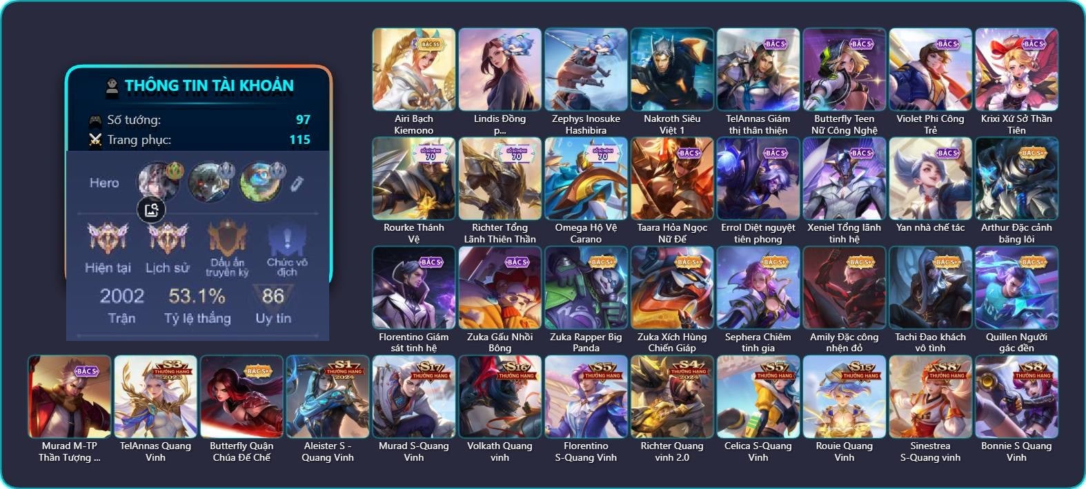 Valhein Hoàng tử Quạ, Valhein Số 7 Thần Sầu, TelAnnas Giám thị thân thiện, Telannas Dạ hội, TelAnnas Quang Vinh, Tel Annas Jujutsu Sorcerer, Arthur Siêu sao Cricket, Arthur Đặc cảnh băng lôi, Butterfly Teen Nữ Công Nghệ, Butterfly Quận Chúa Đế Chế, Violet Phi Công Trẻ, Violet Huy Chương Vàng, Ilumia Nữ Chúa Tuyết, Krixi Xứ Sở Thần Tiên, Krixi Phó văn nghệ, Krixi Thuỷ Thủ, Amily Đặc công nhện đỏ, Amily Nữ đội trưởng, Amily Thám tử trung học, Natalya Quý Cô Thủy Tề, Triệu Vân Quý Công Tử, Allain Lân sư Vũ thần, Alice Xứ sở thần tiên, Alice The Butterfly Mansion Girl, Maloch Ác nhân vô tuyến, Stuart Vua hề, Grakk Màu cờ sắc áo, Enzo Phẩm chất quý tộc, Enzo Thần thoại Hy Lạp, Yorn Đặc Nhiệm Swat, Ngộ Không Đạo tặc, Airi Bạch Kiemono, KilGroth Cảnh Vệ Biển, Zill Thần mộng mị, Omega Hộ vệ ba bích, Omega Hộ Vệ Carano, Aleister S - Quang Vinh, Mganga Doombot Hủy Diệt, Paine khúc nhạc tử vong, Dextra Chiến binh quyến rũ, Dextra Quý cô Tuổi Dần, Tulen Phù Thủy Kiến Tạo, Murad Thợ Săn Tiền Thưởng, Murad M-TP Thần Tượng Học Đường, Murad Điệp viên Anubis, Murad S-Quang Vinh, Zuka Phát Tài, Zuka Gấu Nhồi Bông, Zuka Đầu bếp hoàng cung, Zuka Rapper Big Panda, Zuka Xích Hùng Chiến Giáp, Lindis Đồng phục Shihakusho, Gildur Đại gia học viện, Gildur Thuyền trưởng râu bạc, Elsu Tuyết ưng, Elsu Xạ Thần Mộng Giới, Arduin, Jinna Đại Tư Tế, Taara Hỏa Ngọc Nữ Đế, Zip Gà siêu quậy, Zip Cá siêu quậy, Zephys Inosuke Hashibira, Kahlii Rối Nước Thuỷ Đình, Volkath Quang vinh, Teemee Thịt xiên nướng, Nakroth Siêu Việt 1, Sephera Chiêm tinh gia, Sephera Phi vụ thế kỷ, Bright Soái ca thánh điện, Bright Kỳ Lân Soái, Tachi Đao khách vô tình, Florentino Vũ kiếm sư, Florentino Giám sát tinh hệ, Florentino Kiếm sĩ Olympic, Florentino S-Quang Vinh, Hayate Bạch ảnh, Hayate Bạch lang, Ybneth Hạt trưởng kiểm lâm, Ybneth Candy Bear, Max Tiểu King Kong, Max Trà Chanh, Raz Đại tù trưởng, Richter Dạ hội, Richter Quang vinh 2.0, Richter Tổng Lãnh Thiên Thần, Errol Diệt nguyệt tiên phong, Thorne Cận vệ hoàng gia, Quillen Sao đỏ học đường, Quillen Người gác đền, Xeniel Thiên Sứ Hủy Diệt, Xeniel Tổng lãnh tinh hệ, Thane Kẻ Hủy Diệt, Fennik Nhà thám hiểm, Fennik Đội đặc nhiệm, Celica S-Quang Vinh, Celica Tâm hồn trà sữa, Kaine Thợ Săn Chính Nghĩa, Rouie Quang Vinh, Annette Xứ sở thần tiên, Qi Blogger Ẩm thực, Keera Học viên Carano, Roxie Hỏa thuật sư, Yan nhà chế tác, Slimz Sứ giả Thiên giới, Elandorr Soái tặc, Dolia Môn đồ tập sự, Sinestrea S-Quang vinh, Omen Sĩ Quan Viễn Chinh, Dirak Cảnh Vệ Bầu Trời, Darcy Nam tước, Krizzix Crursed Corpse, Ryoma Thợ Săn Tiền Thưởng, Bonnie S Quang Vinh, Rourke Thánh Vệ, Yena Hoa tiêu Mộng giới|