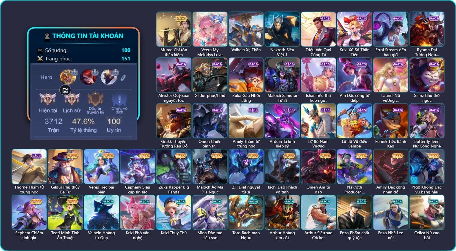 Valhein Hoàng tử Quạ, Valhein Xạ Thần, Valhein S-Quang Vinh, Triệu Vân Quý Công Tử, Krixi Xứ Sở Thần Tiên, Krixi Phó văn nghệ, Krixi Thuỷ Thủ, Mina Tiểu thư đoạt hồn, Mina Tiệc Bánh Kẹo, Mina Đào tạo siêu sao, Veera My Melodys Love, Toro Bạch mao Ngưu, Arthur Hoàng kim cốt, Arthur Siêu sao Cricket, Enzo Phẩm chất quý tộc, Enzo Nhà Leo núi, Celica Nữ cao bồi, Celica S-Quang Vinh, Ata Tân thủy thủ, Ata Mèo đi mưa, Murad Chí tôn thần kiếm, Murad S-Quang Vinh, Hayate Bạch ảnh, Hayate Bạch lang, Volkath Tư lệnh viễn chinh, Volkath Quang vinh, Qi Tiểu long, Qi Thiếu nữ pháo hoa, Qi Blogger Ẩm thực, TelAnnas Cảnh Vệ Rừng, Telannas Thánh nữ mật hội, Telannas Dạ hội, TelAnnas Quang Vinh, Quillen Trưởng ngoại khoa, Quillen Sao đỏ học đường, Errol Stream đến bao giờ, Zephys Oán linh, Zephys Tư lệnh viễn chinh, Zephys Đầu bếp Sashimi, Raz Đại tù trưởng, Raz Saitama Cosplay, Ryoma Thợ Săn Tiền Thưởng, Ryoma Đại Tướng Nguyệt Tộc, Ryoma Dạ hội, Ryoma Ailing Samurai, Aleister Quỷ soái nguyệt tộc, Aleister S - Quang Vinh, Gildur phượt thủ, Gildur Đại gia học viện, Gildur Đại võ sư, Gildur Phù thủy Ba Tư, Taara Tư lệnh hải âu, Florentino Vũ kiếm sư, Florentino Thần thoại Hy Lạp, Florentino S-Quang Vinh, Veres Tiệc bãi biển, Richter Quang vinh 2.0, Richter Cứu hộ, Capheny Hầu gái, Capheny Siêu cấp tin tặc, Capheny S-Quang Vinh, Kaine Đôi Cánh Đại Dương, Kaine Người dơi, Kaine Thợ Săn Chính Nghĩa, Violet Nữ đặc cảnh, Violet Phó học tập, Yena Nữ cướp biển, Zip Cá siêu quậy, Zuka Đại Phú Ông, Zuka Gấu Nhồi Bông, Zuka Đầu bếp hoàng cung, Zuka Rapper Big Panda, KilGroth Cảnh Vệ Biển, KilGroth Càn Nguyên Thủ Vệ, Maloch Ác Ma Địa Ngục, Maloch Samurai Tử Sĩ, Maloch Đại ca Mukbang, Laville Tay súng vô địch, Ishar Tiểu thư kẹo ngọt, Zill Diệt nguyệt tử sĩ, Zill Thần mộng mị, Airi Đặc công tử điệp, Airi Lễ hội mùa xuân, Airi Quản lý tài năng, Lauriel Đọa Lạc Thiên Sứ, Lauriel Nữ vương học đường 2, Kahlii Siêu đầu bếp, Kahlii Tử điệp, Dextra Quý cô Tuổi Dần, Dextra Lữ khách cao nguyên, Allain Lân sư Vũ thần, Slimz Chú thỏ ngọc, Slimz Sứ giả Thiên giới, Slimz Siêu Cấp Tối Thượng, Iggy Bạch hồ ly, Elsu Xạ Thần Mộng Giới, Tachi Đao khách vô tình, Grakk Thuyền Trưởng Râu Đỏ, Grakk Màu cờ sắc áo, Natalya Quý Cô Thủy Tề, Mganga Hề cung đình, Mganga Doombot Hủy Diệt, Omen Ám tử đao, Omen Chiến binh trăng khuyết, Omen Thuyền trưởng hải tặc, Nakroth Quân đoàn địa ngục, Nakroth Producer Tia chớp, Nakroth Siêu Việt 1, Amily Đặc công nhện đỏ, Amily Nữ đội trưởng, Amily Khủng long xanh, Amily Thám tử trung học, Roxie Lễ hội hoa, Roxie Hỏa thuật sư, Ngộ Không Đạo tặc, Ngộ Không Đặc vụ băng hầu, Ngộ Không Cổ thần Ai Cập, Arduin, Arduin Tà linh hiệp sỹ, Ignis Hỏa Thuật Sư, Azzenka Quang Vinh 2.0, Sephera Chiêm tinh gia, Sephera Thủy Liên Hoa, Lumburr Dung Nham, Tulen Dạ hội, Rouie Quang Vinh, Lữ Bố Nam Vương, Lữ Bố Vũ điệu Samba, Liliana Hồ Quý Phi, Liliana Thuỷ thủ hồ ly, Fennik Nhà thám hiểm, Fennik Đội đặc nhiệm, Fennik Tiệc Bánh Kẹo, Fennik Tay đua F1, Fennik Shipper Siêu thanh, Alice Nhà chiêm tinh, Alice Dạ hội, Thane Khoảnh khắc vinh quang, Rourke Cuồng tặc, Butterfly Teen Nữ Công Nghệ, Thorne Thám tử trung học, Bijan Giai Điệu Giáng Sinh, Teemee Thịt xiên nướng, Baldum Thế Giới Kẹo Ngọt, Baldum Đồ chơi, Keera Hồ điệp, Xeniel Shipper bánh mỳ, Yan Giấc mơ sao, Teeri Minh Tinh Ảo Thuật, Dirak Cảnh Vệ Bầu Trời, Bonnie S Quang Vinh