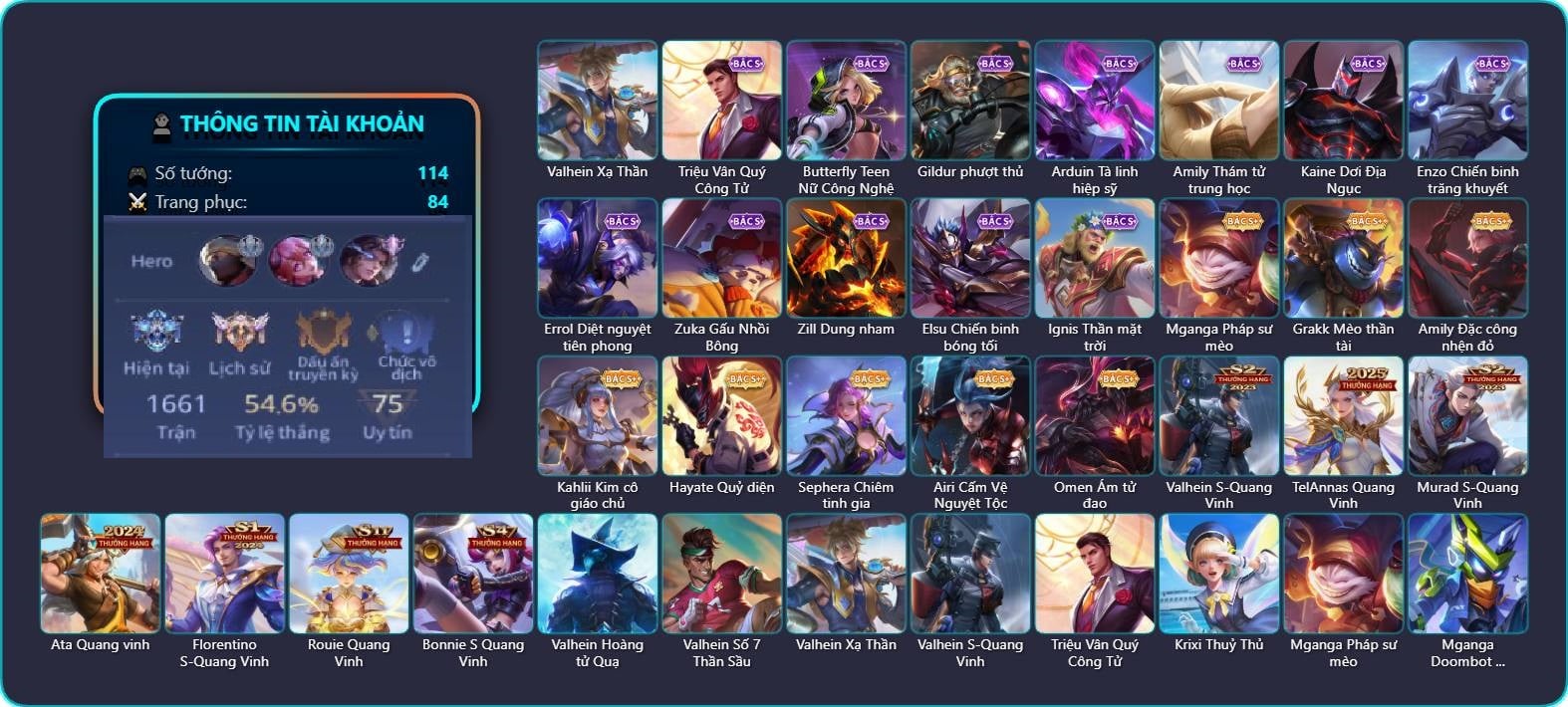 Valhein Hoàng tử Quạ, Valhein Số 7 Thần Sầu, Valhein Xạ Thần, Valhein S-Quang Vinh, Triệu Vân Quý Công Tử, Krixi Thuỷ Thủ, Mganga Pháp sư mèo, Mganga Doombot Hủy Diệt, Grakk Mèo thần tài, Grakk Màu cờ sắc áo, Butterfly Teen Nữ Công Nghệ, Maloch Ác nhân vô tuyến, Preyta Không Tặc, Fennik Nhà thám hiểm, Zephys Tư lệnh viễn chinh, Gildur phượt thủ, Arduin, Arduin Tà linh hiệp sỹ, Veera Thiên nga đen, Amily Đặc cảnh NYPD, Amily Đặc công nhện đỏ, Amily Hội ám hoàng, Amily Thám tử trung học, Kahlii Kim cô giáo chủ, Kahlii Tử điệp, Kaine Đôi Cánh Đại Dương, Kaine Dơi Địa Ngục, Kaine Người dơi, Kaine Thợ Săn Chính Nghĩa, TelAnnas Cảnh Vệ Rừng, TelAnnas Chung Tình Tiễn, Telannas Dạ hội, TelAnnas Quang Vinh, Natalya Quý Cô Thủy Tề, Quillen Sao đỏ học đường, Murad Thợ Săn Tiền Thưởng, Murad Điệp viên Anubis, Murad S-Quang Vinh, Violet Nữ đặc cảnh, Violet Huy Chương Vàng, Dirak Cảnh Vệ Bầu Trời, Dirak Quý tộc, Dirak Ông bầu Showbiz, Qi Thiếu nữ pháo hoa, Hayate Bạch ảnh, Hayate Quỷ diện, Hayate Bạch lang, Ata Quang vinh, Ata Mèo đi mưa, Enzo Phẩm chất quý tộc, Enzo Chiến binh trăng khuyết, Enzo Nhà Leo núi, Errol Diệt nguyệt tiên phong, Richter Dạ hội, Florentino Vũ kiếm sư, Florentino Kiếm sĩ Olympic, Florentino Thần thoại Hy Lạp, Florentino S-Quang Vinh, Sephera Chiêm tinh gia, Raz Đại tù trưởng, Raz Saitama Cosplay, Zuka Phát Tài, Zuka Gấu Nhồi Bông, Thorne Cận vệ hoàng gia, Zill Lốc Địa Ngục, Zill Dung nham, Zill Thần mộng mị, Liliana Thuỷ thủ hồ ly, Arum Nữ hoàng gấu xám, Keera Y tá lạ, Keera Học viên Carano, Tachi S-Vinh Quang, Airi Cấm Vệ Nguyệt Tộc, Zata Tư lệnh viễn chinh, Dextra Quý cô Tuổi Dần, Elsu Chiến binh bóng tối, Arthur Siêu sao Cricket, Roxie Lễ hội hoa, Rouie Quang Vinh, Ignis Thần mặt trời, Slimz Thỏ Thợ Mỏ, Omen Sĩ Quan Viễn Chinh, Omen Ám tử đao, Bonnie S Quang Vinh