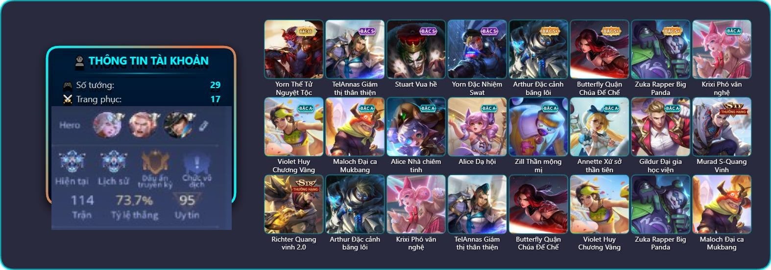 Arthur Đặc cảnh băng lôi, Krixi Phó văn nghệ, TelAnnas Giám thị thân thiện, Butterfly Quận Chúa Đế Chế, Violet Huy Chương Vàng, Zuka Rapper Big Panda, Maloch Đại ca Mukbang, Stuart Vua hề, Alice Nhà chiêm tinh, Alice Dạ hội, Yorn Thế Tử Nguyệt Tộc, Yorn Đặc Nhiệm Swat, Murad S-Quang Vinh, Zill Thần mộng mị, Annette Xứ sở thần tiên, Richter Quang vinh 2.0, Gildur Đại gia học viện