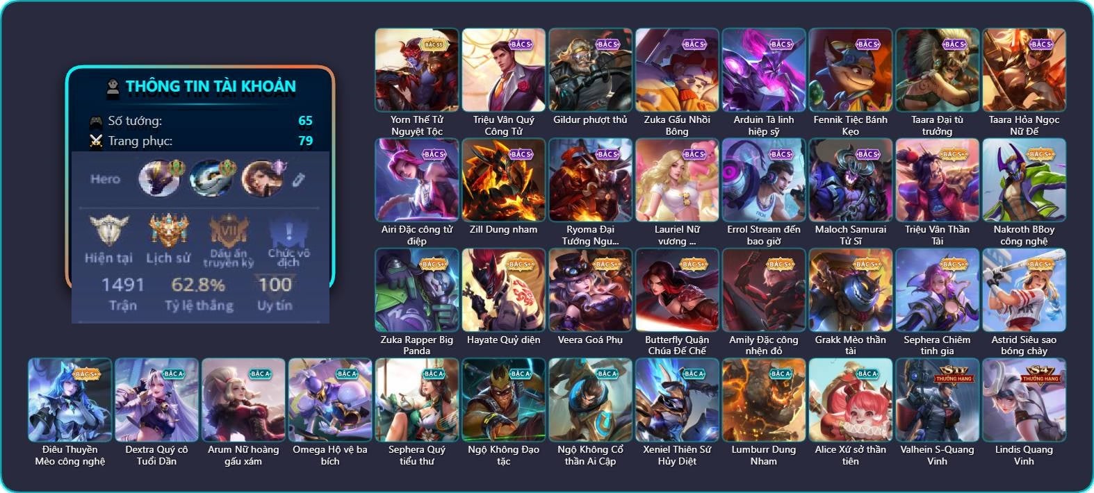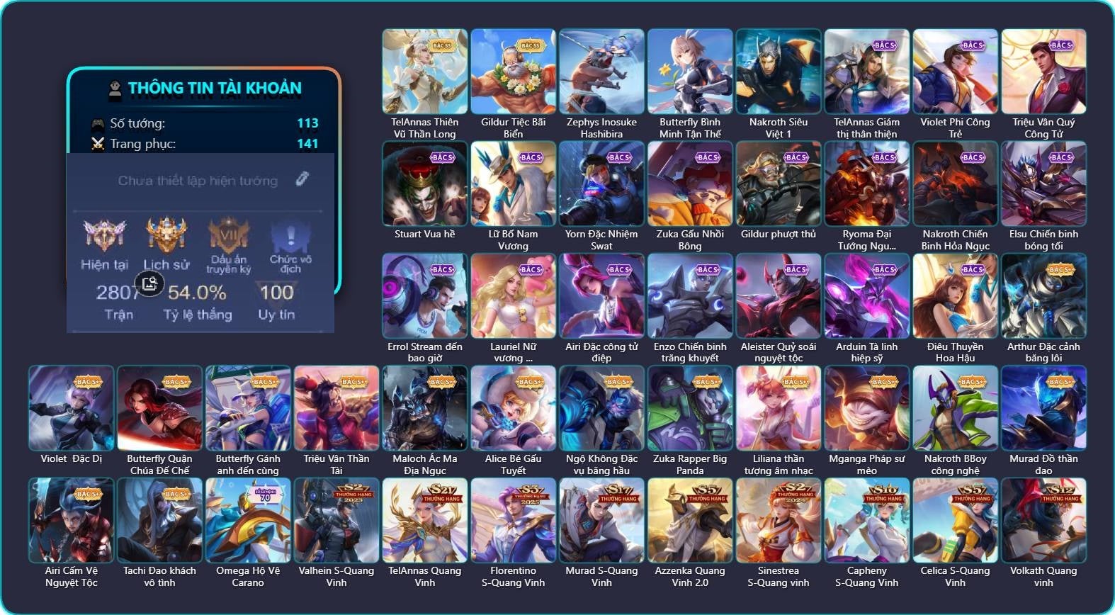 Valhein S-Quang Vinh, Triệu Vân Quý Công Tử, Triệu Vân Thần Tài, Lindis Quang Vinh, Mganga Hề cung đình, Gildur phượt thủ, Krixi Phó văn nghệ, Krixi Thần Thoại Hy Lạp, Krixi Thuỷ Thủ, Kahlii Tử điệp, Nakroth BBoy công nghệ, Slimz Thỏ Thợ Mỏ, Zuka Đại Phú Ông, Zuka Gấu Nhồi Bông, Zuka Rapper Big Panda, Arduin Quang Vinh, Arduin Tà linh hiệp sỹ, Veres Đạo tặc, Rourke Pháo Thủ Tuộc Neo, TeeMee Xiếc Cung Đình, Violet Nữ đặc cảnh, Violet Huy Chương Vàng, Fennik Nhà thám hiểm, Fennik Tiệc Bánh Kẹo, Fennik Tay đua F1, Fennik Shipper Siêu thanh, Kaine Người dơi, Hayate Quỷ diện, Hayate Bạch lang, Max Quang Vinh, Rouie Quang Vinh, Preyta Phi cơ F1, Kriknak Bọ Cánh Bạc, Taara Đại tù trưởng, Taara Hỏa Ngọc Nữ Đế, Qi Thiếu nữ pháo hoa, Airi Đặc công tử điệp, Airi Lễ hội mùa xuân, Volkath Quang vinh, Zill Dung nham, Zill Thần mộng mị, Murad S-Quang Vinh, Veera Goá Phụ, Celica Nữ cao bồi, Annette Xứ sở thần tiên, Laville Tay súng vô địch, Yorn Thế Tử Nguyệt Tộc, Yena Nữ hoàng thể thao, Ryoma Đại Tướng Nguyệt Tộc, Ryoma Dạ hội, Butterfly Quận Chúa Đế Chế, TelAnnas Chung Tình Tiễn, TelAnnas Quang Vinh, Dirak Quý tộc, Dirak Ông bầu Showbiz, Dirak Đường chủ yêu giới, Enzo Phẩm chất quý tộc, Lauriel Nữ vương học đường 2, Dextra Quý cô Tuổi Dần, Ata Quang vinh, Amily Đặc công nhện đỏ, Amily Hội ám hoàng, Errol Stream đến bao giờ, Grakk Mèo thần tài, Arum Nữ hoàng gấu xám, Omega Hộ vệ ba bích, Sephera Quý tiểu thư, Sephera Chiêm tinh gia, Ngộ Không Đạo tặc, Ngộ Không Cổ thần Ai Cập, Roxie Lễ hội hoa, Xeniel Thiên Sứ Hủy Diệt, Xeniel Trung Vệ Thép, Lumburr Dung Nham, Astrid Siêu sao bóng chày, Điêu Thuyền Mèo công nghệ, Alice Xứ sở thần tiên, Maloch Samurai Tử Sĩ, Azzenka Ghẹo hay kẹo