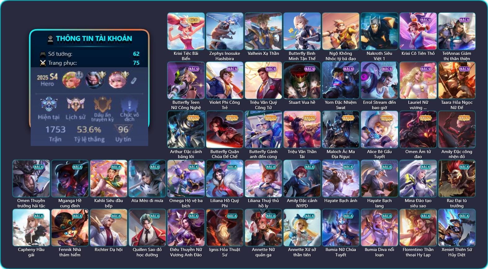 Krixi Tiệc Bãi Biển, Krixi Cô Tiên Thỏ, Krixi Phó văn nghệ, Krixi Thuỷ Thủ, TelAnnas Cảnh Vệ Rừng, TelAnnas Giám thị thân thiện, Telannas Dạ hội, TelAnnas Quang Vinh, Valhein Xạ Thần, Valhein S-Quang Vinh, Arthur Hoàng kim cốt, Arthur Đặc cảnh băng lôi, Butterfly Teen Nữ Công Nghệ, Butterfly Quận Chúa Đế Chế, Butterfly Gánh anh đến cùng, Butterfly Bình Minh Tận Thế, Violet Nữ đặc cảnh, Violet Phi Công Trẻ, Violet Phó học tập, Triệu Vân Quý Công Tử, Triệu Vân Thần Tài, Maloch Ác Ma Địa Ngục, Stuart Vua hề, Alice Bé Gấu Tuyết, Alice Xứ sở thần tiên, Alice Dạ hội, Alice The Butterfly Mansion Girl, Ngộ Không Nhóc tỳ bá đạo, Ngộ Không Cổ thần Ai Cập, Yorn Đặc Nhiệm Swat, Laville Tay đua đường phố, Zephys Inosuke Hashibira, Omen Sĩ Quan Viễn Chinh, Omen Ám tử đao, Omen Thuyền trưởng hải tặc, Mganga Hề cung đình, Kahlii Siêu đầu bếp, Roxie Lễ hội hoa, Ata Mèo đi mưa, Omega Hộ vệ ba bích, Liliana Hồ Quý Phi, Liliana Thuỷ thủ hồ ly, Amily Đặc cảnh NYPD, Amily Đặc công nhện đỏ, Hayate Bạch ảnh, Hayate Bạch lang, Mina Tiểu thư đoạt hồn, Mina Đào tạo siêu sao, Zuka Phát Tài, Errol Stream đến bao giờ, Raz Đại tù trưởng, Raz Saitama Cosplay, Nakroth Siêu Việt 1, Capheny Hầu gái, Fennik Nhà thám hiểm, Richter Dạ hội, Quillen Sao đỏ học đường, Điêu Thuyền Nữ Vương Anh Đào, Ignis Hỏa Thuật Sư, Baldum chú thợ ống nước, Annette Nữ quản ga, Annette Xứ sở thần tiên, Ilumia Nữ Chúa Tuyết, Ilumia Diva nổi loạn, Lauriel Nữ vương học đường 2, Taara Hỏa Ngọc Nữ Đế, Florentino Thần thoại Hy Lạp, Tulen Phù Thủy Kiến Tạo, Rouie Quang Vinh, Xeniel Thiên Sứ Hủy Diệt, Xeniel Kim sí điểu, Dirak Cảnh Vệ Bầu Trời, Murad S-Quang Vinh, Volkath Tư lệnh viễn chinh, Volkath Quang vinh