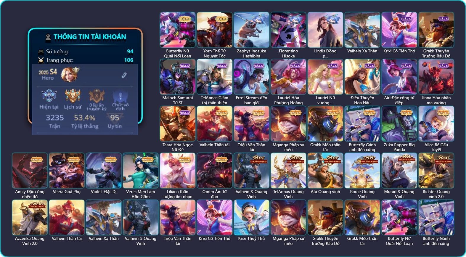 Valhein Thần tài, Valhein Xạ Thần, Valhein S-Quang Vinh, Triệu Vân Thần Tài, Krixi Cô Tiên Thỏ, Krixi Thuỷ Thủ, Mganga Pháp sư mèo, Grakk Thuyền Trưởng Râu Đỏ, Grakk Mèo thần tài, Butterfly Nữ Quái Nổi Loạn, Butterfly Gánh anh đến cùng, Maloch Samurai Tử Sĩ, Maloch Ác nhân vô tuyến, Maloch Đại ca Mukbang, TelAnnas Cảnh Vệ Rừng, TelAnnas Giám thị thân thiện, Telannas Dạ hội, TelAnnas Quang Vinh, Omega Hộ vệ ba bích, Zephys Inosuke Hashibira, Zephys Đầu bếp Sashimi, Dirak Quý tộc, Dirak Đường chủ yêu giới, Zuka Đầu bếp hoàng cung, Zuka Rapper Big Panda, Ata Quang vinh, Ata Mèo đi mưa, Sephera Quý tiểu thư, Sephera Phi vụ thế kỷ, Sephera Thủy Liên Hoa, Alice Bé Gấu Tuyết, Alice Xứ sở thần tiên, Alice Dạ hội, Alice The Butterfly Mansion Girl, Max Tiểu King Kong, Amily Đặc công nhện đỏ, Amily Hội ám hoàng, Errol Stream đến bao giờ, Bright Soái ca thánh điện, Bright Kỳ Lân Soái, Veera Goá Phụ, Veera Thiên nga đen, Lauriel Đọa Lạc Thiên Sứ, Lauriel Hỏa Phượng Hoàng, Lauriel Nữ vương học đường 2, Arum Nữ hoàng gấu xám, Natalya Quý Cô Thủy Tề, Tulen Phù Thủy Kiến Tạo, Tulen Dạ hội, Krizzix Đội đặc nhiệm, Violet Đặc Dị, Violet Huy Chương Vàng, Quillen Trưởng ngoại khoa, Florentino Vũ kiếm sư, Florentino Thần thoại Hy Lạp, Florentino Hisoka, Veres Đạo tặc, Veres Men Lam Hồn Gốm, Kaine Người dơi, Ngộ Không Cổ thần Ai Cập, Liliana thần tượng âm nhạc, Liliana Thuỷ thủ hồ ly, Điêu Thuyền Nữ y tá, Điêu Thuyền Hoa Hậu, Qi Thiếu nữ pháo hoa, Qi Blogger Ẩm thực, Yorn Thế Tử Nguyệt Tộc, Yorn Soái ca bãi biển, Dextra Quý cô Tuổi Dần, Airi Đặc công tử điệp, Hayate Bạch ảnh, Hayate Bạch lang, Lindis Thám Tử Tư, Lindis Đồng phục Shihakusho, Zip Cá siêu quậy, Zill Thần mộng mị, Roxie Lễ hội hoa, Roxie Hỏa thuật sư, Mina Tiểu thư đoạt hồn, Mina Chị đại lắm chiêu, Mina Tiệc Bánh Kẹo, Mina Đào tạo siêu sao, Celica Tâm hồn trà sữa, Helen Ngủ trong rừng, Thorne Cận vệ hoàng gia, Volkath Dạ Huyết Tộc, Jinna Hỏa nhãn ma vương, Paine khúc nhạc tử vong, Aya Điệp viên ký ức, Laville Tay đua đường phố, Rouie Quang Vinh, Fennik Nhà thám hiểm, Fennik Đội đặc nhiệm, Enzo Thần thoại Hy Lạp, Murad S-Quang Vinh, Taara Hỏa Ngọc Nữ Đế, Omen Ám tử đao, Kahlii Tử điệp, Keera Học viên Carano, Keera Nghệ sĩ Graffiti, Ilumia Ngược dòng thời gian, Richter Quang vinh 2.0, Azzenka Quang Vinh 2.0, Sinestrea Lữ khách sa mạc, Slimz Lẩu chua cay, KilGroth Cảnh Vệ Biển