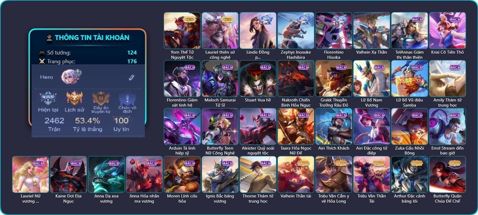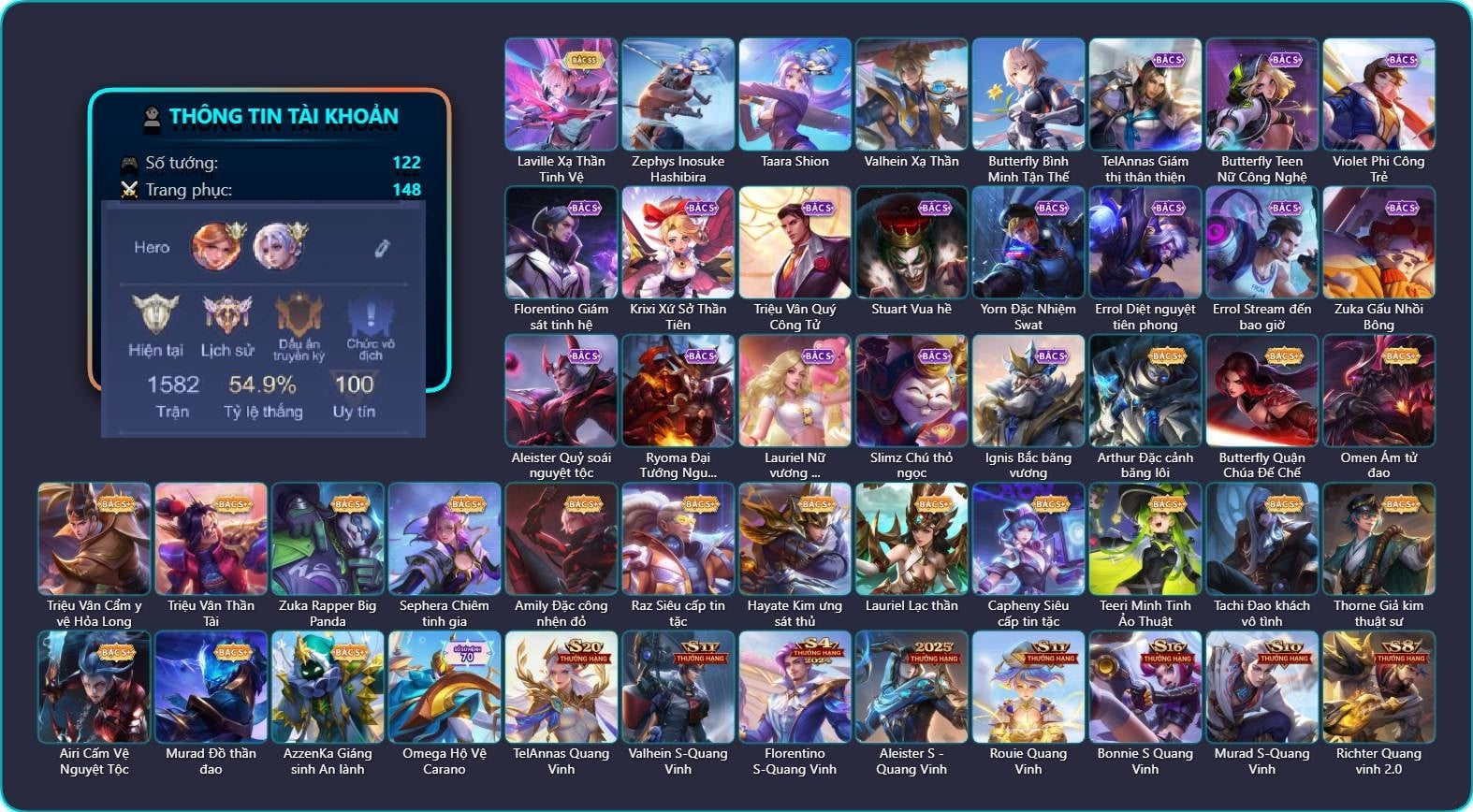 Valhein Hoàng tử Quạ, Valhein Số 7 Thần Sầu, Valhein Thần tài, Valhein Xạ Thần, Valhein S-Quang Vinh, Triệu Vân Cẩm y vệ Hỏa Long, Triệu Vân Thần Tài, TelAnnas Giám thị thân thiện, Telannas Dạ hội, TelAnnas Quang Vinh, Tel Annas Jujutsu Sorcerer, Arthur Hoàng kim cốt, Arthur Đặc cảnh băng lôi, Krixi Cô Tiên Thỏ, Krixi Phó văn nghệ, Krixi Thuỷ Thủ, Butterfly Teen Nữ Công Nghệ, Butterfly Quận Chúa Đế Chế, Butterfly Gánh anh đến cùng, Natalya Quý Cô Thủy Tề, Allain Thần mặt trời, Maloch Ác Ma Địa Ngục, Maloch Samurai Tử Sĩ, Maloch Ác nhân vô tuyến, Maloch Đại ca Mukbang, Veera Goá Phụ, Stuart Vua hề, Kahlii Siêu đầu bếp, Kahlii Tử điệp, Mganga Hề cung đình, Mganga Pháp sư mèo, Mganga Doombot Hủy Diệt, Nakroth Chiến Binh Hỏa Ngục, Nakroth BBoy công nghệ, Nakroth Quán quân, Grakk Thuyền Trưởng Râu Đỏ, Grakk Khô Lâu Đại Tướng, Grakk Màu cờ sắc áo, Grakk Thần ẩm thực, Gildur Đại gia học viện, Gildur Đại võ sư, Ngộ Không Ngộ Khá Trẩu, Ngộ Không Tề Thiên ma hầu, Ngộ Không Cổ thần Ai Cập, Lữ Bố Nam Vương, Lữ Bố Kỵ Sĩ Âm Phủ, Lữ Bố Vũ điệu Samba, Amily Hội ám hoàng, Amily Nữ đội trưởng, Amily Thám tử trung học, Lindis Thám Tử Tư, Lindis Đồng phục Shihakusho, Ryoma Dạ hội, Qi Tiểu long, Qi Thiếu nữ pháo hoa, Qi Blogger Ẩm thực, Arum Thú Vệ Cổ Mộ, Arduin Tà linh hiệp sỹ, Arduin Chiến Binh cổ Đại, Zill Thần mộng mị, Tulen Đông êm đềm, Tulen Dạ hội, Toro Bạch mao Ngưu, Zephys Phi thương, Zephys Hắc vô thường, Zephys Inosuke Hashibira, Zephys Đầu bếp Sashimi, Aleister Thiếu Niên Hắc Ám, Aleister Quỷ soái nguyệt tộc, Aleister Xứ sở thần tiên, Aleister Tư lệnh viễn chinh, Aleister Ảo thuật gia, Violet Nữ đặc cảnh, Violet Đặc Dị, Violet Tay Súng Siêu Phẩm, Violet Huy Chương Vàng, Enzo Phẩm chất quý tộc, Enzo Nhà Leo núi, Yorn Thế Tử Nguyệt Tộc, Dextra Quý cô Tuổi Dần, Dextra Lữ khách cao nguyên, Ilumia Diva nổi loạn, Zata Tư lệnh viễn chinh, Bright Kỳ Lân Soái, Florentino Giám sát tinh hệ, Florentino Hisoka, Florentino S-Quang Vinh, Rourke Pháo Thủ Tuộc Neo, Rourke Cuồng tặc, Hayate Bạch ảnh, Hayate Ngân lang, Hayate Quỷ diện, Hayate Bạch lang, Liliana thần tượng âm nhạc, Liliana Thuỷ thủ hồ ly, Taara Hỏa Ngọc Nữ Đế, Elsu Tuyết ưng, Elsu Xạ Thần Mộng Giới, Zip Cá siêu quậy, Zip Ông trùm giáng sinh, Teemee Thịt xiên nướng, Airi Thích Khách, Airi Đặc công tử điệp, Zuka Gấu Nhồi Bông, Zuka Đầu bếp hoàng cung, Zuka Rapper Big Panda, Zuka Xích Hùng Chiến Giáp, Slimz Thỏ nhồi bông, Slimz Lẩu chua cay, Slimz Sứ giả Thiên giới, Roxie Lễ hội hoa, Roxie Hỏa thuật sư, Alice Xứ sở thần tiên, Alice Dạ hội, Alice The Butterfly Mansion Girl, Dirak Cảnh Vệ Bầu Trời, Raz Đại tù trưởng, Errol Stream đến bao giờ, Richter Thống soái kháng chiến, Richter Dạ hội, Richter Quang vinh 2.0, Wonder Woman Thế Chiến, Mina Tiểu thư đoạt hồn, Mina Đào tạo siêu sao, Omega Cỗ Máy Siêu Tốc, Omega Hộ vệ ba bích, Murad Thợ Săn Tiền Thưởng, Murad S-Quang Vinh, Tachi Lãng khách, Omen Thuyền trưởng hải tặc, Điêu Thuyền Nữ Vương Anh Đào, Laville Tay đua đường phố, Laville Kim quy thần vương, Ybneth Candy Bear, Lauriel Đọa Lạc Thiên Sứ, Lauriel thiên sứ công nghệ, Lauriel Nữ vương học đường 2, Kaine Đôi Cánh Đại Dương, Kaine Dơi Địa Ngục, Kaine Người dơi, Kaine Thợ Săn Chính Nghĩa, Volkath Dạ Huyết Tộc, Volkath Xung thiên thần tướng, Volkath Tư lệnh viễn chinh, Rouie Quang Vinh, Fennik Nhà thám hiểm, Fennik Đội đặc nhiệm, Fennik Shipper Siêu thanh, Paine khúc nhạc tử vong, Yena Nữ hoàng thể thao, Yena Nữ cướp biển, Yena Hoa tiêu Mộng giới, Jinna Dạ xoa vương, Jinna Hỏa nhãn ma vương, Max Găng Tay Vàng, Max Chuyên gia đập hộp, Max Trà Chanh, Bonnie S Quang Vinh, Xeniel Thiên Sứ Hủy Diệt, Celica Tâm hồn trà sữa, Sephera Thủy Liên Hoa, Moren Lính cứu hỏa, Thane Kẻ Hủy Diệt, Quillen Trưởng ngoại khoa, Keera Nghệ sĩ Graffiti, Ignis Bắc băng vương, Ignis Vì sao con khóc, Capheny S-Quang Vinh, Azzenka Ghẹo hay kẹo, Azzenka Quang Vinh 2.0, Azzenka U Hồn Sa Mạc, Ata Mèo đi mưa, Aya Điệp viên ký ức, Sinestrea Lữ khách sa mạc, Thorne Cận vệ hoàng gia, Thorne Thám tử trung học