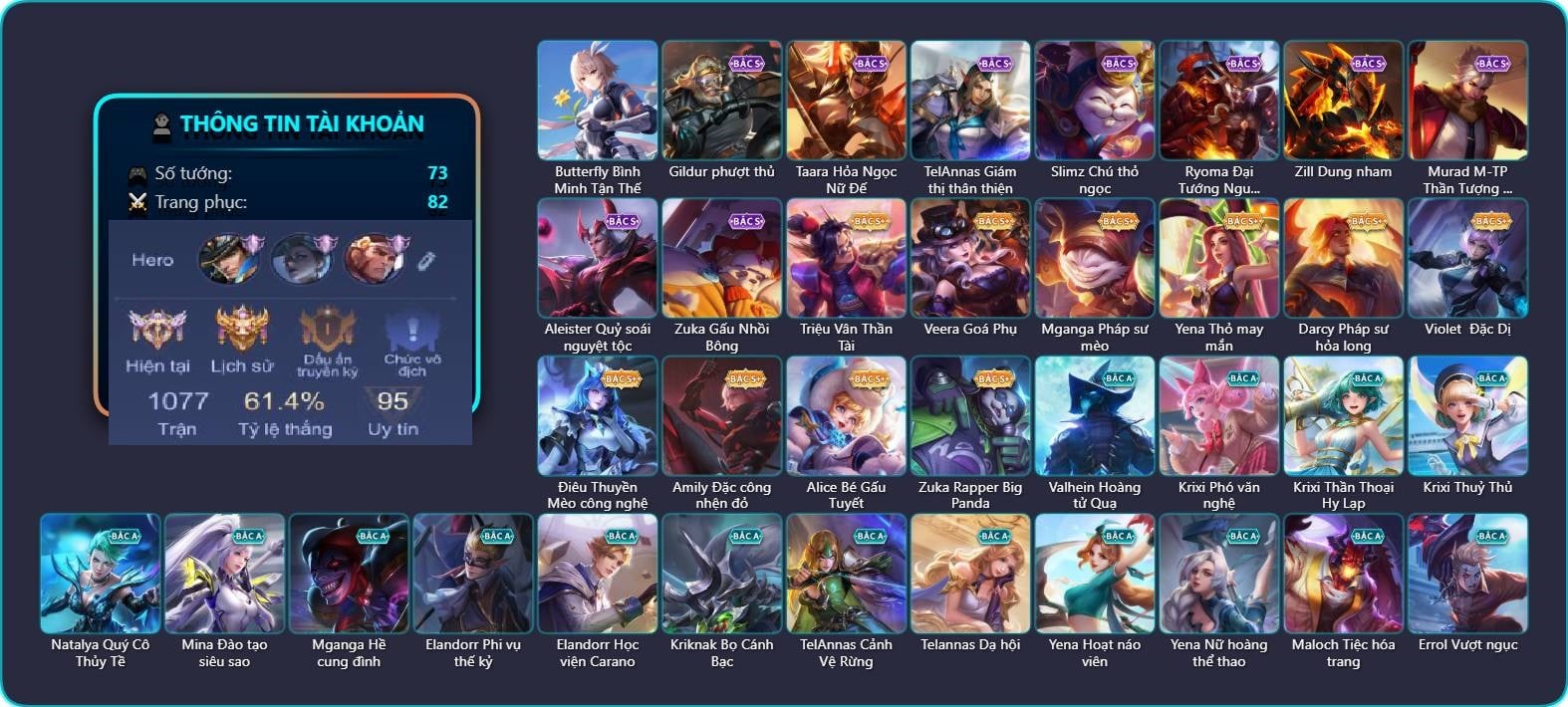 Valhein Hoàng tử Quạ, Valhein Số 7 Thần Sầu, Valhein S-Quang Vinh, Triệu Vân Thần Tài, Krixi Phó văn nghệ, Krixi Thần Thoại Hy Lạp, Krixi Thuỷ Thủ, Veera Goá Phụ, Butterfly Bình Minh Tận Thế, Gildur phượt thủ, Natalya Quý Cô Thủy Tề, Taara Hỏa Ngọc Nữ Đế, Mina Chị đại lắm chiêu, Mina Đào tạo siêu sao, Mganga Hề cung đình, Mganga Pháp sư mèo, Elandorr Phi vụ thế kỷ, Elandorr Học viện Carano, Max Quang Vinh, Kriknak Bọ Cánh Bạc, TelAnnas Cảnh Vệ Rừng, TelAnnas Giám thị thân thiện, Telannas Dạ hội, TelAnnas Quang Vinh, Roxie Lễ hội hoa, Teemee Tay đua siêu tốc, Rouie Quang Vinh, Yena Thỏ may mắn, Yena Hoạt náo viên, Yena Nữ hoàng thể thao, Slimz Chú thỏ ngọc, Maloch Tiệc hóa trang, Preyta Phi cơ F1, Darcy Pháp sư hỏa long, Errol Vượt ngục, Enzo Phẩm chất quý tộc, Violet Nữ đặc cảnh, Violet Đặc Dị, Violet Huy Chương Vàng, Laville Tay súng vô địch, Qi Thiếu nữ pháo hoa, Qi Blogger Ẩm thực, Airi Lễ hội mùa xuân, Cresht Thợ sửa cáp, Ryoma Đại Tướng Nguyệt Tộc, Điêu Thuyền Mèo công nghệ, Zill Dung nham, Dirak Quý tộc, Dirak Ông bầu Showbiz, Fennik Nhà thám hiểm, Fennik Đội đặc nhiệm, Murad M-TP Thần Tượng Học Đường, Murad S-Quang Vinh, Ata Quang vinh, Ngộ Không Đạo tặc, Dextra Chiến binh quyến rũ, Omen Sĩ Quan Viễn Chinh, Amily Đặc cảnh NYPD, Amily Đặc công nhện đỏ, Amily Hội ám hoàng, Volkath Tư lệnh viễn chinh, Volkath Quang vinh, Arum Thú Vệ Cổ Mộ, Raz Đại tù trưởng, Aleister Quỷ soái nguyệt tộc, Baldum Thế Giới Kẹo Ngọt, Alice Bé Gấu Tuyết, Liliana Thuỷ thủ hồ ly, Azzenka Quang Vinh 2.0, Elsu Mafia, Quillen Sao đỏ học đường, Lumburr Dung Nham, Zuka Phát Tài, Zuka Gấu Nhồi Bông, Zuka Rapper Big Panda, Arthur Siêu sao Cricket, Richter Quang vinh 2.0, Florentino S-Quang Vinh, Annette Xứ sở thần tiên, Xeniel Kim sí điểu, Ybneth Hạt trưởng kiểm lâm, Krizzix Crursed Corpse