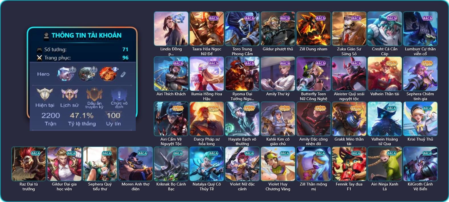 Valhein Hoàng tử Quạ, Valhein Thần tài, Krixi Thuỷ Thủ, Taara Hỏa Ngọc Nữ Đế, Toro Trung Phong Cắm, Raz Đại tù trưởng, Raz Saitama Cosplay, Gildur phượt thủ, Gildur Đại gia học viện, Sephera Quý tiểu thư, Sephera Chiêm tinh gia, Moren Anh thợ điện, Kriknak Bọ Cánh Bạc, Natalya Quý Cô Thủy Tề, Violet Nữ đặc cảnh, Violet Huy Chương Vàng, Zill Dung nham, Zill Thần mộng mị, Zuka Giáo Sư Sừng Sỏ, Zuka Phát Tài, Cresht Cá Cắn Cáp, Lumburr Cự thần viễn cổ, Fennik Tay đua F1, Fennik Shipper Siêu thanh, Airi Thích Khách, Airi Ninja Xanh Lá, Airi Cấm Vệ Nguyệt Tộc, Airi Lễ hội mùa xuân, KilGroth Cảnh Vệ Biển, Mganga Hề cung đình, TelAnnas Cảnh Vệ Rừng, Telannas Thánh nữ mật hội, Telannas Dạ hội, TelAnnas Quang Vinh, Tel Annas Jujutsu Sorcerer, Ilumia Nữ Chúa Tuyết, Ilumia Hồng Hoa Hậu, Ignis Quang Vinh, Preyta Phi cơ F1, Marja Linh Xà Tư Tế, Jinna Đại Tư Tế, Errol Vượt ngục, Kaine Đôi Cánh Đại Dương, Enzo Phẩm chất quý tộc, Enzo Nhà Leo núi, Darcy Pháp sư hỏa long, Omega Cỗ Máy Siêu Tốc, Omega Hộ vệ ba bích, Lindis Đồng phục Shihakusho, Ybneth Candy Bear, Hayate Bạch ảnh, Hayate Bạch lang, Hayate Bạch vô thường, Celica S-Quang Vinh, Rouie Quang Vinh, Dirak Quý tộc, Dirak Ông bầu Showbiz, Tulen Nhà Thám Hiểm, Tulen Phù Thủy Kiến Tạo, Florentino Vũ kiếm sư, Florentino S-Quang Vinh, Annette Nữ quản ga, Annette Xứ sở thần tiên, Arthur Hoàng kim cốt, Arthur Lãnh chúa xương, Arthur Siêu sao Cricket, Ryoma Thợ Săn Tiền Thưởng, Ryoma Đại Tướng Nguyệt Tộc, Laville Tay súng vô địch, Yorn Soái ca bãi biển, Kahlii Kim cô giáo chủ, Volkath Quang vinh, Qi Tiểu long, Qi Thiếu nữ pháo hoa, Qi Blogger Ẩm thực, Zip Cá siêu quậy, Veres Chị đại học đường, Zata Tư lệnh viễn chinh, Amily Đặc công nhện đỏ, Amily Thư ký, Amily Hội ám hoàng, Grakk Mèo thần tài, Grakk Thần ẩm thực, Ata Mèo đi mưa, Điêu Thuyền Nữ y tá, Butterfly Teen Nữ Công Nghệ, Elsu Xạ Thần Mộng Giới, Roxie Lễ hội hoa, Aleister Quỷ soái nguyệt tộc, Aleister S - Quang Vinh, Liliana Thuỷ thủ hồ ly, Elandorr Soái tặc, Elandorr Phi vụ thế kỷ, Xeniel Thiên Sứ Hủy Diệt, Bijan Giai Điệu Giáng Sinh, Bonnie S Quang Vinh