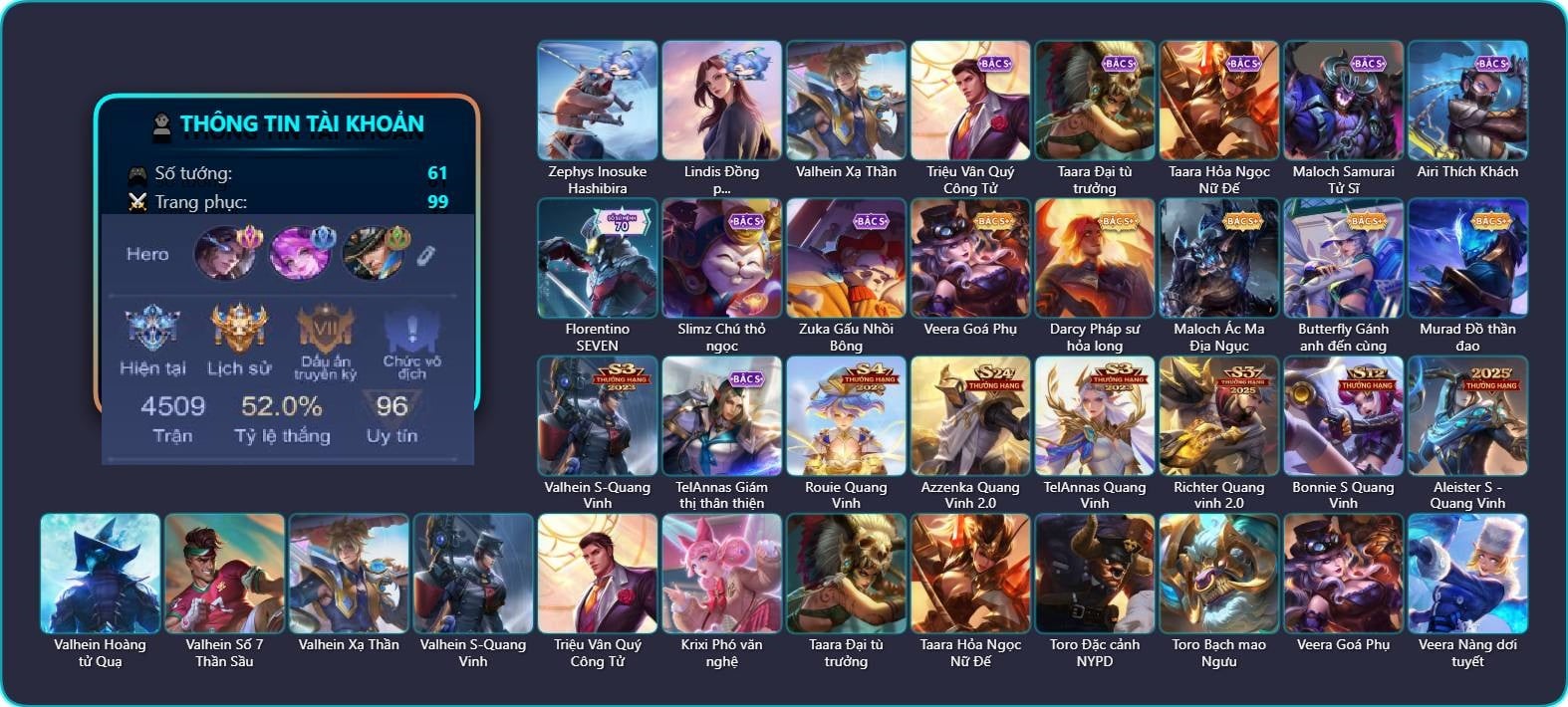 Valhein Hoàng tử Quạ, Valhein Số 7 Thần Sầu, Valhein Xạ Thần, Valhein S-Quang Vinh, Triệu Vân Quý Công Tử, Krixi Phó văn nghệ, Taara Đại tù trưởng, Taara Hỏa Ngọc Nữ Đế, Toro Đặc cảnh NYPD, Toro Bạch mao Ngưu, Veera Goá Phụ, Veera Nàng dơi tuyết, Veera Thiên nga đen, Keera Y tá lạ, Zephys Inosuke Hashibira, Omega Cỗ Máy Siêu Tốc, Omega Hộ vệ ba bích, Laville Tay súng vô địch, Rouie Quang Vinh, Teemee Tay đua siêu tốc, Teemee Thịt xiên nướng, Zill Lốc Địa Ngục, Preyta Phi cơ F1, Cresht Thợ sửa cáp, Ignis Hỏa Thuật Sư, Azzenka Ghẹo hay kẹo, Azzenka Quang Vinh 2.0, Fennik Nhà thám hiểm, Fennik Tay đua F1, Darcy Nam tước, Darcy Pháp sư hỏa long, Qi Thiếu nữ pháo hoa, Qi Blogger Ẩm thực, Maloch Ác Ma Địa Ngục, Maloch Samurai Tử Sĩ, Kahlii Siêu đầu bếp, Ybneth Hạt trưởng kiểm lâm, Enzo Phẩm chất quý tộc, Enzo Thần thoại Hy Lạp, Enzo Nhà Leo núi, Dirak Quý tộc, Florentino Vũ kiếm sư, Florentino Kiếm sĩ Olympic, Florentino Thần thoại Hy Lạp, Florentino SEVEN, Elandorr Soái tặc, Elandorr Phi vụ thế kỷ, Hayate Bạch ảnh, Hayate Bạch lang, Airi Thích Khách, Airi Lễ hội mùa xuân, TelAnnas Cảnh Vệ Rừng, TelAnnas Giám thị thân thiện, Telannas Thánh nữ mật hội, Telannas Dạ hội, TelAnnas Quang Vinh, Điêu Thuyền Nữ Vương Anh Đào, Omen Thuyền trưởng hải tặc, Lindis Thám Tử Tư, Lindis Đồng phục Shihakusho, Butterfly Gánh anh đến cùng, Arthur Hoàng kim cốt, Arthur Siêu sao Cricket, Richter Bá tước, Richter Quang vinh 2.0, Lauriel Đọa Lạc Thiên Sứ, Murad Thợ Săn Tiền Thưởng, Murad Đồ thần đao, Murad Thiên Tài Sân Cỏ, Murad Điệp viên Anubis, Slimz Chú thỏ ngọc, Alice Nhà chiêm tinh, Veres Chị đại học đường, Thane Kẻ Hủy Diệt, Zuka Gấu Nhồi Bông, Zuka Đầu bếp hoàng cung, Ata Mèo đi mưa, Elsu Cảnh vệ thảo nguyên, Roxie Lễ hội hoa, Ngộ Không Đạo tặc, Ngộ Không Cổ thần Ai Cập, Raz Đại tù trưởng, Tulen Phù Thủy Kiến Tạo, Natalya Quý Cô Thủy Tề, Ryoma Thợ Săn Tiền Thưởng, Violet Phó học tập, Violet Huy Chương Vàng, Ilumia Nữ Chúa Tuyết, Grakk Khô Lâu Đại Tướng, Grakk Màu cờ sắc áo, Grakk Thần ẩm thực, Arduin Cận vệ hoàng gia, Wisp Hải Tặc Nhí, Bonnie S Quang Vinh, KilGroth Cảnh Vệ Biển, Liliana Hồ Quý Phi, Liliana Thuỷ thủ hồ ly, Aleister S - Quang Vinh, Annette Xứ sở thần tiên