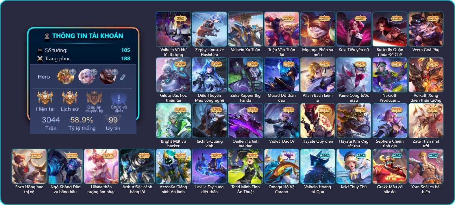 Valhein Hoàng tử Quạ, Valhein Vũ khí tối thượng, Valhein Xạ Thần, Valhein S-Quang Vinh, Triệu Vân Quý Công Tử, Triệu Vân Thần Tài, Mganga Pháp sư mèo, Mganga Doombot Hủy Diệt, Krixi Xứ Sở Thần Tiên, Krixi Tiểu yêu nữ, Krixi Thuỷ Thủ, Grakk Màu cờ sắc áo, Grakk Thần ẩm thực, Butterfly Quận Chúa Đế Chế, Maloch Samurai Tử Sĩ, Yorn Soái ca bãi biển, Yorn Thương Nhân Sa Mạc, Toro Bạch mao Ngưu, Toro Ngưu hải vương, Preyta Không Tặc, Teemee Thịt xiên nướng, Veera Goá Phụ, Veera Phù thủy Hội họa, Gildur phượt thủ, Gildur Đại gia học viện, Gildur Bác học thiên tài, Lumburr Dung Nham, Dirak Quý tộc, Dirak Đường chủ yêu giới, Arduin Cận vệ hoàng gia, Arduin Tà linh hiệp sỹ, Điêu thuyền Vũ điệu nghê thường, Điêu Thuyền Mèo công nghệ, Zuka Phát Tài, Zuka Gấu Nhồi Bông, Zuka Đầu bếp hoàng cung, Zuka Rapper Big Panda, Amily Hội ám hoàng, Amily Thám tử trung học, Taara Hỏa Ngọc Nữ Đế, Kaine Đôi Cánh Đại Dương, Kaine Người dơi, Lauriel Nữ vương học đường 2, Lauriel Đôi cánh Nguyệt thực, Elsu Guitar tình ái, Elsu Tuyết ưng, Zephys Tư lệnh viễn chinh, Zephys Inosuke Hashibira, Zephys Đầu bếp Sashimi, KilGroth Cảnh Vệ Biển, Ata Quang vinh, Ata Mèo đi mưa, Dextra Lữ khách cao nguyên, Thorne Cận vệ hoàng gia, Zill Lốc Địa Ngục, Zill Dung nham, TelAnnas Cảnh Vệ Rừng, Telannas Dạ hội, TelAnnas Quang Vinh, Natalya Nghệ nhân lân, Natalya Quý Cô Thủy Tề, Natalya Quà Quái Quỷ, Murad Thợ Săn Tiền Thưởng, Murad Đồ thần đao, Murad S-Quang Vinh, Murad Thần Pháo Hoa, Allain Bạch kiếm sĩ, Allain Lân sư Vũ thần, Kahlii Tử điệp, Paine khúc nhạc tử vong, Paine Công tước máu, Errol Diệt nguyệt tiên phong, Keera Thuỷ thủ, Keera Nghệ sĩ Graffiti, Keera Hồ điệp, Capheny Hầu gái, Capheny S-Quang Vinh, Max Hiệp Sĩ Nhí, Max Găng Tay Vàng, Max Chuyên gia đập hộp, Xeniel Kim sí điểu, Xeniel Shipper bánh mỳ, Nakroth Producer Tia chớp, Volkath Xung thiên thần tướng, Volkath Tư lệnh viễn chinh, Volkath Quang vinh, Slimz Sứ giả Thiên giới, Slimz Siêu Cấp Tối Thượng, Celica Nữ cao bồi, Celica S-Quang Vinh, Astrid Bạch Kiếm Tiểu Thư, Bright Mật vụ hacker, Tachi S-Quang vinh, Raz Đại tù trưởng, Raz Saitama Cosplay, Quillen Tà linh ma đao, Arum Linh tượng vu nữ, Arum Nữ hoàng gấu xám, Thane Kẻ Hủy Diệt, Moren Anh thợ điện, Violet Phó học tập, Violet Đặc Dị, Violet Tay Súng Siêu Phẩm, Hayate Bạch ảnh, Hayate chiến binh trăng khuyết, Hayate Quỷ diện, Hayate Kim ưng sát thủ, Hayate Bạch lang, Sephera Chiêm tinh gia, Sephera Thủy Liên Hoa, Qi Tiểu long, Qi Thiếu nữ pháo hoa, Qi Blogger Ẩm thực, Roxie Lễ hội hoa, Ryoma Thợ Săn Tiền Thưởng, Ryoma Đại Tướng Nguyệt Tộc, Ryoma Dạ hội, Ryoma Ailing Samurai, Airi Đặc công tử điệp, Airi Quản lý tài năng, Florentino Vũ kiếm sư, Florentino Thần thoại Hy Lạp, Florentino S-Quang Vinh, Alice Xứ sở thần tiên, Alice The Butterfly Mansion Girl, Aoi Sát Thủ Đô Thị, Yan Giấc mơ sao, Sinestrea Lữ khách sa mạc, Sinestrea S-Quang vinh, Richter Dạ hội, Richter Quang vinh 2.0, Richter Cứu hộ, Kriknak Bọ Cánh Bạc, Kriknak Bọ Hoàng Kim, Tulen Phù Thủy Kiến Tạo, Tulen Đông êm đềm, Tulen Phó kỷ luật, Tulen Dạ hội, Zata Tư lệnh viễn chinh, Zata Thần mặt trời, Lorion Chiến giáp hắc ám, Rouie Quang Vinh, Elandorr Phi vụ thế kỷ, Elandorr Học viện Carano, Stuart Gã hề, Enzo Phẩm chất quý tộc, Enzo Thần thoại Hy Lạp, Enzo Nhà Leo núi, Enzo Hồng hạc thị vệ, Yena Nữ cướp biển, Yena Hoa tiêu Mộng giới, Bonnie S Quang Vinh, Ilumia Nữ Chúa Tuyết, Ilumia Ngược dòng thời gian, Ngộ Không Đặc vụ băng hầu, Ngộ Không Cổ thần Ai Cập, Lữ Bố Hoả Long Chiến Thần, Omen Sĩ Quan Viễn Chinh, Omen Thuyền trưởng hải tặc, Liliana Hồ Quý Phi, Liliana thần tượng âm nhạc, Liliana Thuỷ thủ hồ ly, Arthur Siêu sao Cricket, Arthur Đặc cảnh băng lôi, Ybneth Hạt trưởng kiểm lâm, Baldum chú thợ ống nước, Baldum Thế Giới Kẹo Ngọt, Baldum Đồ chơi, Ishar Giấc Mơ Ngọt Ngào, Azzenka Quang Vinh 2.0, AzzenKa Giáng sinh An lành, Azzenka U Hồn Sa Mạc, Aleister Thiếu Niên Hắc Ám, Aleister S - Quang Vinh, Veres Thần thoại Hy Lạp, Laville Tay đua đường phố, Laville Tay súng diệt thần, Laville S Quang Vinh, Fennik Tiệc Bánh Kẹo, Fennik Shipper Siêu thanh, Fennik Cáo chiêu tài, Teeri Minh Tinh Ảo Thuật, Omega Hộ Vệ Carano, Bijan Giai Điệu Giáng Sinh, Zip Cá siêu quậy, Caesar Bão tố, Jinna Hỏa nhãn ma vương, Krizzix Cún siêu quậy|