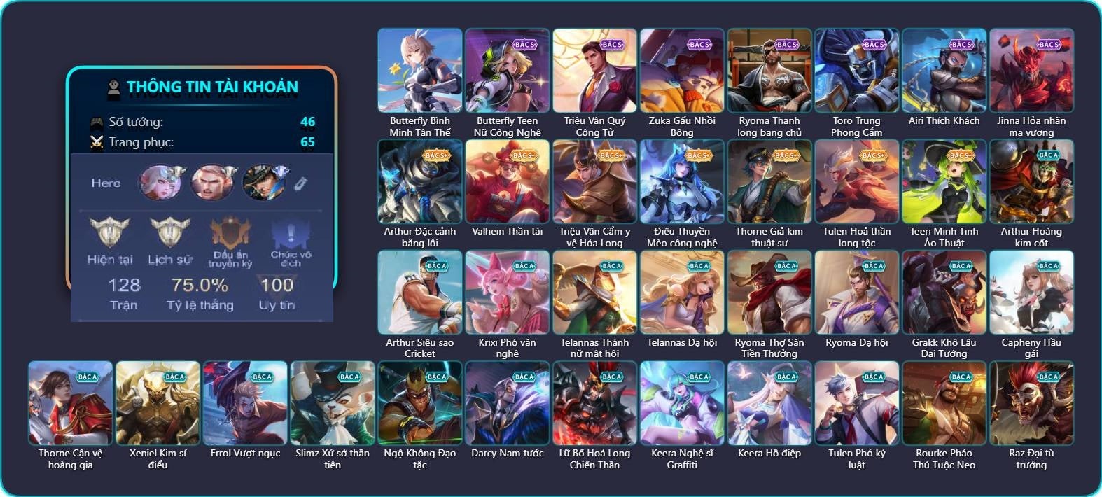 Arthur Hoàng kim cốt, Arthur Siêu sao Cricket, Arthur Đặc cảnh băng lôi, Krixi Phó văn nghệ, Telannas Thánh nữ mật hội, Telannas Dạ hội, Tel Annas Jujutsu Sorcerer, Valhein Số 7 Thần Sầu, Valhein Thần tài, Butterfly Xuân nữ ngổ ngáo, Butterfly Teen Nữ Công Nghệ, Butterfly Bình Minh Tận Thế, Butterfly Ninh Thần, Triệu Vân Quý Công Tử, Triệu Vân Cẩm y vệ Hỏa Long, Zuka Phát Tài, Zuka Gấu Nhồi Bông, Điêu Thuyền Mèo công nghệ, Bijan Giai Điệu Giáng Sinh, Ryoma Thợ Săn Tiền Thưởng, Ryoma Thanh long bang chủ, Ryoma Dạ hội, Grakk Khô Lâu Đại Tướng, Capheny Hầu gái, Thorne Cận vệ hoàng gia, Thorne Giả kim thuật sư, Xeniel Kim sí điểu, Laville S Quang Vinh, Errol Vượt ngục, Slimz Xứ sở thần tiên, Ngộ Không Đạo tặc, Allain Lân sư Vũ thần, Darcy Nam tước, Volkath Quang vinh, Lữ Bố Hoả Long Chiến Thần, Toro Trung Phong Cắm, Keera Nghệ sĩ Graffiti, Keera Hồ điệp, Tulen Phó kỷ luật, Tulen Hoả thần long tộc, Rourke Pháo Thủ Tuộc Neo, Raz Đại tù trưởng, Hayate Bạch ảnh, KilGroth Cảnh Vệ Biển, Kriknak Bọ Cánh Bạc, Omen Sĩ Quan Viễn Chinh, Murad Thợ Săn Tiền Thưởng, Murad Thiên Tài Sân Cỏ, Murad Thần Pháo Hoa, Quillen Trưởng ngoại khoa, Bonnie S Quang Vinh, Ybneth Candy Bear, Yena Hoa tiêu Mộng giới, Elsu Xạ Thần Mộng Giới, Teeri Minh Tinh Ảo Thuật, Amily Khủng long xanh, Airi Thích Khách, Airi Quản lý tài năng, Yorn Cung thủ bóng đêm, Yorn Thương Nhân Sa Mạc, Zill Quái xế, Jinna Hỏa nhãn ma vương, Omega Cỗ Máy Siêu Tốc, Lorion Chiến giáp hắc ám, Yan Giấc mơ sa