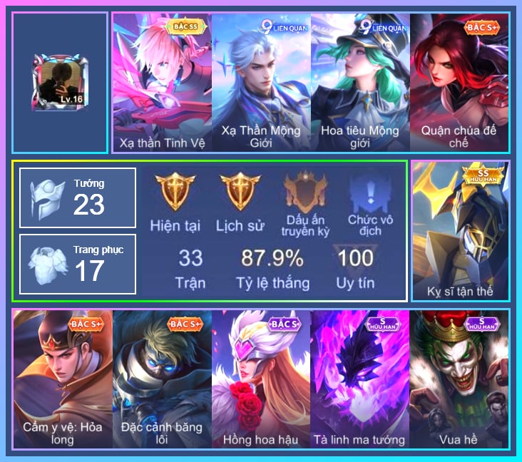 Valhein Hoàng tử Quạ, Valhein Vũ khí tối thượng, Valhein Số 7 Thần Sầu, Valhein S-Quang Vinh, Krixi Công chúa Bướm, Krixi Phó văn nghệ, Krixi Thần Thoại Hy Lạp, Krixi Thuỷ Thủ, Gildur Đại gia học viện, Mganga Doombot Hủy Diệt, Grakk Thuyền Trưởng Râu Đỏ, Grakk Màu cờ sắc áo, Grakk Thần ẩm thực, Maloch Ác nhân vô tuyến, Annette Xứ sở thần tiên, Preyta Không Tặc, Skud Sơn Tặc, Veera Thiên nga đen, Veera Đánh cắp trái tim, Arduin, Arduin Tà linh hiệp sỹ, Arduin Đường vào tim em, Amily Hội ám hoàng, Amily Thám tử trung học, Kaine Người dơi, Kaine Thợ Săn Chính Nghĩa, Veres Đạo tặc, Toro Trung Phong Cắm, Toro Ngưu hải vương, Zephys Phi thương, Zephys Tư lệnh viễn chinh, Dirak Quý tộc, Dirak Đường chủ yêu giới, Taara Hỏa Ngọc Nữ Đế, Yorn Thần Thoại Hy Lạp, Yorn Soái ca bãi biển, Omen Sĩ Quan Viễn Chinh, Omen Ám tử đao, Omen Thuyền trưởng hải tặc, Max Hiệp Sĩ Nhí, Max Tiểu King Kong, Ilumia Nữ Chúa Tuyết, Ilumia Ngược dòng thời gian, TelAnnas Cảnh Vệ Rừng, Telannas Thánh nữ mật hội, Telannas Dạ hội, TelAnnas Quang Vinh, Lữ Bố Nam Vương, Lữ Bố Hoả Long Chiến Thần, Kahlii Kim cô giáo chủ, Kahlii Siêu đầu bếp, Ryoma Thợ Săn Tiền Thưởng, Alice Xứ sở thần tiên, Alice bé du xuân, Alice The Butterfly Mansion Girl, Qi Thiếu nữ pháo hoa, Hayate Bạch ảnh, Hayate Bạch lang, Airi Ninja Xanh Lá, Airi Phó kiếm đạo, Airi Đặc công tử điệp, Sephera Chiêm tinh gia, Sephera Phi vụ thế kỷ, Paine khúc nhạc tử vong, Roxie Hầu gái, Roxie Lễ hội hoa, Errol Vượt ngục, Errol Sát thủ Mafia, Ybneth Hạt trưởng kiểm lâm, Thorne Thám tử trung học, Raz Đại tù trưởng, Nakroth Siêu Việt 1, Jinna Hỏa nhãn ma vương, Florentino S-Quang Vinh, Zill Thần mộng mị, Arthur Siêu sao Cricket, Elandorr Học viện Carano, Rouie Quang Vinh, Murad S-Quang Vinh, Quillen Trưởng ngoại khoa, Kriknak Bọ Cánh Bạc, Caesar Bão tố, Ignis Bắc băng vương, Slimz Thỏ Thợ Mỏ, Slimz Thỏ nhồi bông, Slimz Lẩu chua cay, Tachi S-Vinh Quang, Bright Kỳ Lân Soái, Liliana Thuỷ thủ hồ ly, KilGroth Cảnh Vệ Biển, Bonnie S Quang Vinh, Xeniel Thiên Sứ Hủy Diệt, Zuka Gấu Nhồi Bông, Zuka Đầu bếp hoàng cung, Zuka Rapper Big Panda, Zuka Xích Hùng Chiến Giáp, Thane Mật vụ, Lauriel Nữ vương học đường 2, Azzenka Quang Vinh 2.0, Ngộ Không Đạo tặc, Ngộ Không Cổ thần Ai Cập, Volkath Xung thiên thần tướng, Volkath Quang vinh, Richter Quang vinh 2.0, Violet Nữ đặc cảnh, Violet Huy Chương Vàng, Enzo Thần thoại Hy Lạp, Fennik Nhà thám hiểm, Sinestrea Lữ khách sa mạc, Capheny S-Quang Vinh, Celica S-Quang Vinh, Arum Thú Vệ Cổ Mộ, Ishar Quận chúa sông Nile