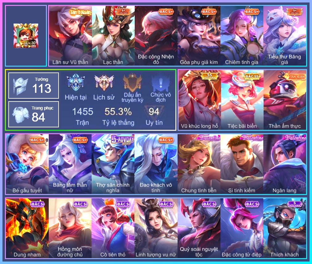 Valhein Hoàng tử Quạ, Valhein Số 7 Thần Sầu, Valhein Xạ Thần, Valhein S-Quang Vinh, TelAnnas Giám thị thân thiện, Telannas Dạ hội, TelAnnas Quang Vinh, Tel Annas Jujutsu Sorcerer, Arthur Hoàng kim cốt, Arthur Lãnh chúa xương, Arthur Siêu sao Cricket, Arthur Đặc cảnh băng lôi, Krixi Cô Tiên Thỏ, Krixi Phó văn nghệ, Krixi Thuỷ Thủ, Violet Đặc Dị, Violet Huy Chương Vàng, Butterfly Teen Nữ Công Nghệ, Butterfly Quận Chúa Đế Chế, Butterfly Bình Minh Tận Thế, Triệu Vân Quý Công Tử, Triệu Vân Thần Tài, Arduin Tà linh hiệp sỹ, Maloch Ác Ma Địa Ngục, Maloch Samurai Tử Sĩ, Maloch Ác nhân vô tuyến, Maloch Đại ca Mukbang, Veera Thiên nga đen, Stuart Vua hề, Tulen Dạ hội, Grakk Thuyền Trưởng Râu Đỏ, Grakk Khô Lâu Đại Tướng, Grakk Màu cờ sắc áo, Grakk Thần ẩm thực, Zill Lốc Địa Ngục, Zill Thần mộng mị, Mganga Pháp sư mèo, Mganga Doombot Hủy Diệt, Toro Đặc cảnh NYPD, Gildur Đại gia học viện, Gildur Thuyền trưởng râu bạc, Ngộ Không Ngộ Khá Trẩu, Ngộ Không Cổ thần Ai Cập, Florentino Giám sát tinh hệ, Florentino Kiếm sĩ Olympic, Florentino Thần thoại Hy Lạp, Florentino Hisoka, Florentino S-Quang Vinh, Zephys Phi thương, Zephys Inosuke Hashibira, Zephys Đầu bếp Sashimi, Quillen Sao đỏ học đường, Quillen Tà linh ma đao, Zuka Gấu Nhồi Bông, Zuka Đầu bếp hoàng cung, Zuka Rapper Big Panda, Yena Nữ cướp biển, Xeniel Thiên Sứ Hủy Diệt, Xeniel Shipper bánh mỳ, Qi Tiểu long, Qi Quán quân, Qi Blogger Ẩm thực, Hayate Bạch ảnh, Hayate Ngân lang, Hayate Bạch lang, Tachi Đao khách vô tình, Volkath Tư lệnh viễn chinh, Volkath Quang vinh, Azzenka Quang Vinh 2.0, AzzenKa Giáng sinh An lành, Capheny Hầu gái, Capheny S-Quang Vinh, Fennik Nhà thám hiểm, Fennik Đội đặc nhiệm, Fennik Tay đua F1, Fennik Shipper Siêu thanh, Murad S-Quang Vinh, Rouie Quang Vinh, Sephera Quý tiểu thư, Sephera Phi vụ thế kỷ, Sephera Thủy Liên Hoa, Kaine Đôi Cánh Đại Dương, Kaine Người dơi, Kaine Thợ Săn Chính Nghĩa, Yorn Thế Tử Nguyệt Tộc, Yorn Soái ca bãi biển, Alice Nhà chiêm tinh, Alice Xứ sở thần tiên, Alice The Butterfly Mansion Girl, Enzo Phẩm chất quý tộc, Enzo Chiến binh trăng khuyết, Enzo Thần thoại Hy Lạp, Enzo Nhà Leo núi, Amily Nữ đội trưởng, Amily Thám tử trung học, Lindis Quang thánh tiễn, Liliana Hồ Quý Phi, Liliana Thuỷ thủ hồ ly, Raz Đại tù trưởng, Kahlii Siêu đầu bếp, Kahlii Tử điệp, Kahlii Rối Nước Thuỷ Đình, Bonnie S Quang Vinh, Slimz Sứ giả Thiên giới, Paine khúc nhạc tử vong, Richter Dạ hội, Richter Quang vinh 2.0, Errol Diệt nguyệt tiên phong, Errol Stream đến bao giờ, Elsu Tuyết ưng, Airi Kiemono, Airi Đặc công tử điệp, Thane Kẻ Hủy Diệt, Skud Sơn Tặc, Skud Tà linh ma tướng, Lauriel Nữ vương học đường 2, Celica Nữ cao bồi, Celica Tâm hồn trà sữa, Kriknak Yêu trùng cổ mộ, Cresht Thợ sửa cáp, Ilumia Diva nổi loạn, Ilumia Ngược dòng thời gian, Ignis Bắc băng vương, Ignis Vì sao con khóc, Keera Nghệ sĩ Graffiti, Bright Kỳ Lân Soái, Mina Tiệc Bánh Kẹo, Mina Lưỡi hái hoàng kim, Mina Đào tạo siêu sao, Arum Thú Vệ Cổ Mộ, Ryoma Đại Tướng Nguyệt Tộc, Ryoma Dạ hội, Roxie Hầu gái, Roxie Hỏa thuật sư, Elandorr Soái tặc, Omega Hộ Vệ Carano, Omen Ám tử đao, Lữ Bố Vũ điệu Samba, Aleister Quỷ soái nguyệt tộc, Aleister Xứ sở thần tiên, KilGroth Cảnh Vệ Biển, Aya Điệp viên ký ức, Ybneth Candy Bear, Astrid Bạch Kiếm Tiểu Thư, Taara Hỏa Ngọc Nữ Đế, Taara Tư lệnh hải âu, Điêu Thuyền Nữ Vương Anh Đào, Sinestrea Lữ khách sa mạc, Dextra Lữ khách cao nguyên, Annette Xứ sở thần tiên, Annette Thần tượng âm nhạc, Ata Mèo đi mưa, Thorne Cận vệ hoàng gia, Thorne Thám tử trung học, Laville Xạ Thần Tinh Vệ, Wisp Hải Tặc Nhí, Wisp Ếch nhồi bông