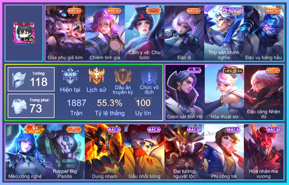Valhein Hoàng tử Quạ, Valhein Số 7 Thần Sầu, Krixi Phó văn nghệ, Krixi Thuỷ Thủ, Veera Goá Phụ, Mganga Doombot Hủy Diệt, Taara Hỏa Ngọc Nữ Đế, Zephys Tư lệnh viễn chinh, Arduin Quang Vinh, Arduin Tà linh hiệp sỹ, Kriknak Bọ Cánh Bạc, Kriknak Yêu trùng cổ mộ, Max Quang Vinh, Zuka Đại Phú Ông, Zuka Gấu Nhồi Bông, Zuka Rapper Big Panda, Violet Nữ đặc cảnh, Violet Phi Công Trẻ, Violet Phó học tập, Violet Đặc Dị, Zill Lốc Địa Ngục, Zill Dung nham, Nakroth Chiến Binh Hỏa Ngục, Ngộ Không Đặc vụ băng hầu, Ngộ Không Nhóc tỳ bá đạo, Butterfly Cẩm y vệ_ Chu Tước, Butterfly Bình Minh Tận Thế, Florentino Giám sát tinh hệ, Florentino S-Quang Vinh, Grakk Khô Lâu Đại Tướng, KilGroth Cảnh Vệ Biển, Murad Thợ Săn Tiền Thưởng, Murad Thiên Tài Sân Cỏ, Murad S-Quang Vinh, Skud Sơn Tặc, Dirak Quý tộc, Keera Y tá lạ, Qi Tiểu long, Richter Bá tước, Richter Quang vinh 2.0, Fennik Nhà thám hiểm, Enzo Phẩm chất quý tộc, Hayate Bạch ảnh, Preyta Phi cơ F1, Lauriel Đọa Lạc Thiên Sứ, Lindis Đồng phục Shihakusho, Maloch Tiệc hóa trang, Cresht Cá Cắn Cáp, Capheny S-Quang Vinh, Aleister Quỷ soái nguyệt tộc, Airi Lễ hội mùa xuân, Roxie Lễ hội hoa, Roxie Hỏa thuật sư, Ryoma Đại Tướng Nguyệt Tộc, Amily Đặc công nhện đỏ, Amily Thư ký, Amily Hội ám hoàng, Zata Tư lệnh viễn chinh, Liliana Thuỷ thủ hồ ly, Raz Đại tù trưởng, Điêu Thuyền Mèo công nghệ, Azzenka Quang Vinh 2.0, Veres Chị đại học đường, Ata Quang vinh, Quillen Trưởng ngoại khoa, Kaine Thợ Săn Chính Nghĩa, Sephera Chiêm tinh gia, Telannas Dạ hội, TelAnnas Quang Vinh, Arthur Siêu sao Cricket, Jinna Hỏa nhãn ma vương, Annette Xứ sở thần tiên, Ignis Hỏa Thuật Sư