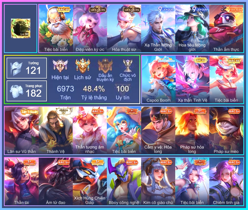 Valhein Hoàng tử Quạ, Valhein S-Quang Vinh, Triệu Vân Quý Công Tử, Triệu Vân Cẩm y vệ_ Hỏa Long, Triệu Vân Thần Tài, Krixi Tiệc Bãi Biển, Krixi Cô Tiên Thỏ, Krixi Phó văn nghệ, Krixi Thuỷ Thủ, Krixi Nàng tiên nổi loạn, Taara Hỏa Ngọc Nữ Đế, Yorn Đặc Nhiệm Swat, Yorn Soái ca bãi biển, Ngộ Không Đạo tặc, Ngộ Không Cổ thần Ai Cập, Murad Thợ Săn Tiền Thưởng, Murad M-TP Thần Tượng Học Đường, Murad S-Quang Vinh, Toro Trung Phong Cắm, Toro Ngưu hải vương, Mganga Hề cung đình, Mganga Pháp sư mèo, Mganga Doombot Hủy Diệt, Liliana Hồ Quý Phi, Liliana thần tượng âm nhạc, Liliana Tiệc bãi biển, Tulen Phù Thủy Kiến Tạo, Kahlii Kim cô giáo chủ, Kahlii Rối Nước Thuỷ Đình, Gildur Tiệc Bãi Biển, Gildur phượt thủ, Gildur Đại gia học viện, Zill Lốc Địa Ngục, Zill Dung nham, Zill Thần mộng mị, Ignis Quang Vinh, Ignis Bắc băng vương, Ignis Vì sao con khóc, Amily Đặc cảnh NYPD, Amily Thám tử trung học, Ilumia Nữ Chúa Tuyết, Ilumia Thiên nữ áo dài, Ilumia Ngược dòng thời gian, Lindis Quang Vinh, Telannas Thánh nữ mật hội, Telannas Dạ hội, TelAnnas Quang Vinh, Tel Annas Jujutsu Sorcerer, Violet Nữ đặc cảnh, Violet Đặc Dị, Arthur Hoàng kim cốt, Arthur Siêu sao Cricket, Quillen Thống soái đế chế, Arduin, Arduin Quang Vinh, Arduin Tà linh hiệp sỹ, Maloch Ác Ma Địa Ngục, Maloch Samurai Tử Sĩ, Maloch Ác nhân vô tuyến, Maloch Đại ca Mukbang, Keera Nghệ sĩ Graffiti, Keera Hồ điệp, Max Hiệp Sĩ Nhí, Max Quang Vinh, Max Trà Chanh, Veera Phù thủy Hội họa, Volkath Tư lệnh viễn chinh, Volkath Quang vinh, Teemee Tay đua siêu tốc, Teemee Giấc Mơ Ngọt Ngào, Darcy Pháp sư hỏa long, Elandorr Học viện Carano, Enzo Chiến binh trăng khuyết, Fennik Nhà thám hiểm, Fennik Đội đặc nhiệm, Fennik Tiệc Bánh Kẹo, Fennik Phi hành gia, Fennik Shipper Siêu thanh, Điêu Thuyền Nữ Vương Anh Đào, Rouie Quang Vinh, Rouie Mèo hầu gái, Veres Đạo tặc, Hayate Bạch ảnh, Hayate Bạch lang, Florentino Kiếm sĩ Olympic, Florentino Thần thoại Hy Lạp, Florentino S-Quang Vinh, Errol Diệt nguyệt tiên phong, Errol Stream đến bao giờ, Richter Quang vinh 2.0, Preyta Phi cơ F1, Grakk Thuyền Trưởng Râu Đỏ, Grakk Thần ẩm thực, Yena Nữ hoàng thể thao, Yena Nữ cướp biển, Yena Hoa tiêu Mộng giới, Mina Đào tạo siêu sao, Ryoma Đại Tướng Nguyệt Tộc, Ryoma Ailing Samurai, Thorne Thám tử trung học, Lauriel Nữ vương học đường 2, Zuka Đầu bếp hoàng cung, Zuka Rapper Big Panda, Zuka Xích Hùng Chiến Giáp, Laville Xạ Thần Tinh Vệ, Dirak Quý tộc, Dirak Đường chủ yêu giới, Lorion Chiến giáp hắc ám, Airi Thích Khách, Airi Quái xế công nghệ, Airi Đặc công tử điệp, Airi Lễ hội mùa xuân, Cresht Cá Cắn Cáp, Caesar Bão tố, Omega Hộ Vệ Carano, Aoi Sát Thủ Đô Thị, Zephys Phi thương, Zephys Đầu bếp Sashimi, Bright Soái ca thánh điện, Astrid thần thoại hy lạp, Astrid Hoa anh đào, Natalya Quý Cô Thủy Tề, Ybneth Candy Bear, Sephera Chiêm tinh gia, Sephera Thủy Liên Hoa, Qi Thiếu nữ pháo hoa, Qi Blogger Ẩm thực, Roxie Cháy Phố, Roxie Lễ hội hoa, Roxie Hỏa thuật sư, Butterfly Teen Nữ Công Nghệ, Butterfly Bình Minh Tận Thế, Raz Đại tù trưởng, Aleister Thiếu Niên Hắc Ám, Aleister Quỷ soái nguyệt tộc, Aleister S - Quang Vinh, Nakroth BBoy công nghệ, Nakroth Producer Tia chớp, Nakroth Siêu Việt 1, Ishar Tiểu thư kẹo ngọt, Ishar Tiểu thư gấu trúc, Ishar Capoo Boom, Elsu Mafia, Elsu Xạ Thần Mộng Giới, Celica S-Quang Vinh, Celica Tâm hồn trà sữa, Aya Điệp viên ký ức, Allain Lân sư Vũ thần, Alice Bé Gấu Tuyết, Alice Xứ sở thần tiên, Alice tiểu tiên tử, Alice The Butterfly Mansion Girl, Zip Gà siêu quậy, Zip Ông trùm giáng sinh, Xeniel Shipper bánh mỳ, Kaine Thợ Săn Chính Nghĩa, Omen Sĩ Quan Viễn Chinh, Omen Ám tử đao, Omen Thuyền trưởng hải tặc, Thane Kẻ Hủy Diệt, Thane Mật vụ, Capheny Hầu gái, Capheny Quân Nhạc Mildar, Capheny S-Quang Vinh, Baldum Đồ chơi, Lữ Bố Vũ điệu Samba, Azzenka Quang Vinh 2.0, Azzenka U Hồn Sa Mạc, Sinestrea Lữ khách sa mạc, Sinestrea S-Quang vinh, Skud Sơn Tặc, Slimz Lẩu chua cay, Slimz Siêu Cấp Tối Thượng, Dextra Lữ khách cao nguyên, Annette Tiệc bãi biển, Bonnie S Quang Vinh, Dolia Hoa tiêu đại dương, Tachi Lãng khách, Tachi Đao khách vô tình, Krizzix Crursed Corpse, Arum Linh tượng vu nữ, Arum Thần tượng nhạc Rock, Rourke Thánh Vệ