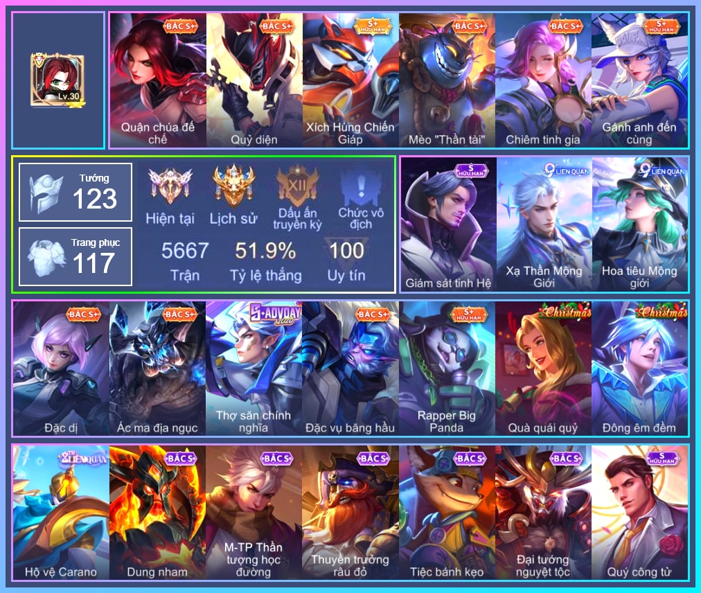 Valhein Hoàng tử Quạ, Valhein Xạ Thần, Valhein S-Quang Vinh, Triệu Vân Quý Công Tử, Krixi Xứ Sở Thần Tiên, Krixi Thuỷ Thủ, Taara Hỏa Ngọc Nữ Đế, Toro Đặc cảnh NYPD, Toro Trung Phong Cắm, Toro Bạch mao Ngưu, Toro Ngưu hải vương, Gildur phượt thủ, Gildur Đại gia học viện, Kriknak Bọ Cánh Bạc, Yorn Soái ca bãi biển, Zuka Phát Tài, Zuka Đầu bếp hoàng cung, Zuka Rapper Big Panda, Zuka Xích Hùng Chiến Giáp, Mganga Doombot Hủy Diệt, Ignis Quang Vinh, Ignis Bắc băng vương, Butterfly Teen Nữ Công Nghệ, Butterfly Quận Chúa Đế Chế, Butterfly Gánh anh đến cùng, Butterfly Bình Minh Tận Thế, Veera Thiên nga đen, Violet Đặc Dị, Violet Tay Súng Siêu Phẩm, Violet Huy Chương Vàng, Natalya Quý Cô Thủy Tề, Natalya Quà Quái Quỷ, Kahlii Siêu đầu bếp, Zephys Inosuke Hashibira, Kaine Người dơi, Kaine Thợ Săn Chính Nghĩa, Omega Hộ vệ ba bích, Omega Hộ Vệ Carano, Tulen Nhà Thám Hiểm, Tulen Phù Thủy Kiến Tạo, Tulen Đông êm đềm, Tulen Dạ hội, Maloch Ác Ma Địa Ngục, Maloch Ác nhân vô tuyến, Preyta Phi cơ F1, TeeMee Xiếc Cung Đình, Teemee Tay đua siêu tốc, Errol Stream đến bao giờ, Rourke Biệt đội siêu hùng, Rourke Cuồng tặc, Veres Đạo tặc, Veres Chị đại học đường, Max Quang Vinh, Murad Thợ Săn Tiền Thưởng, Murad M-TP Thần Tượng Học Đường, Murad S-Quang Vinh, Volkath Tư lệnh viễn chinh, Volkath Quang vinh, Nakroth Producer Tia chớp, Zill Dung nham, Zill Thần mộng mị, Zill Quái xế, Hayate Quỷ diện, Hayate Bạch lang, Yena Hoa tiêu Mộng giới, Laville Tay súng vô địch, Qi Thiếu nữ pháo hoa, Qi Blogger Ẩm thực, Ryoma Đại Tướng Nguyệt Tộc, Ryoma Ailing Samurai, Ngộ Không Đạo tặc, Ngộ Không Đặc vụ băng hầu, Ngộ Không Nhóc tỳ bá đạo, Ngộ Không Cổ thần Ai Cập, Slimz Sứ giả Thiên giới, Slimz Siêu Cấp Tối Thượng, Quillen Huyết phong, Ata Quang vinh, Ata Mèo đi mưa, Capheny S-Quang Vinh, Sephera Chiêm tinh gia, Sephera Thủy Liên Hoa, Roxie Lễ hội hoa, Telannas Dạ hội, TelAnnas Quang Vinh, Điêu Thuyền Nữ Vương Anh Đào, Điêu Thuyền Nữ y tá, Điêu thuyền Vũ điệu nghê thường, Raz Saitama Cosplay, Fennik Đội đặc nhiệm, Fennik Tiệc Bánh Kẹo, Fennik Tay đua F1, Airi Đặc công tử điệp, Elsu Xạ Thần Mộng Giới, Florentino Giám sát tinh hệ, Florentino S-Quang Vinh, Liliana Thuỷ thủ hồ ly, Alice The Butterfly Mansion Girl, Rouie Quang Vinh, Jinna Dạ xoa vương, Grakk Thuyền Trưởng Râu Đỏ, Grakk Mèo thần tài, Grakk Màu cờ sắc áo, Richter Quang vinh 2.0, Amily Nữ đội trưởng, Baldum Đồ chơi, Omen Thuyền trưởng hải tặc, Tachi Đao khách vô tình, Enzo Phẩm chất quý tộc, Arthur Siêu sao Cricket, Thane Kẻ Hủy Diệt, Sinestrea S-Quang vinh, Bonnie S Quang Vinh, Thorne Thám tử trung học, Azzenka U Hồn Sa Mạc, Aleister S - Quang Vinh, Ming thầy tướng